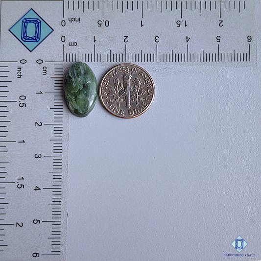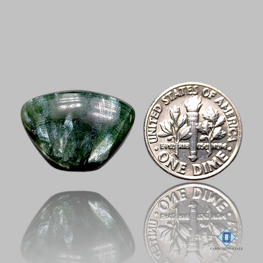 Quality in seraphinite is all about that feathery chatoyancy and the depth of green. You want a dark-to-medium forest medium-forest-green base with clear, silvery, reflective feather patterns—those wings are the main event. When I evaluate a cab, I look for strong feather contrast, minimal surface fractures, and a smooth polish that highlights shimmer.