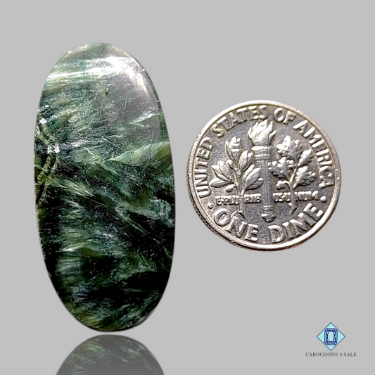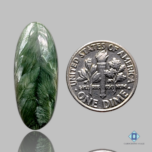 - Classic Feathery Seraphinite—Deep green base with pronounced silvery feather chatoyance. Perfect for statement oval Seraphinite cabochons for sale. A crowd favorite.