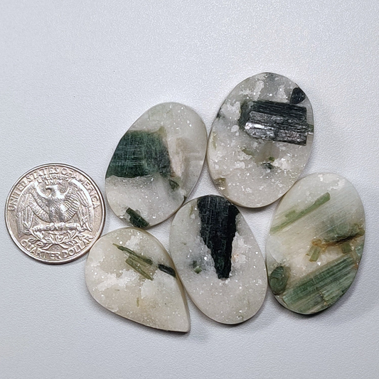 Tourmaline’s cabochons color spectrum is making them a popular choice for any jewelers, collectors. Bright pink and red (Rubellite) color valued for their deep and attractive tones. Deep blue and green (Indicolite and Verdellite) colors famous for their rich saturation. Neon blue-green (Paraíba Tourmaline) color is rare and most expensive varieties in tourmaline. Bi-colored and tri-colored (Watermelon Tourmaline) is unique for their elegant color combinations. Black (Schorl) tourmaline is a grounding and protective variety.
