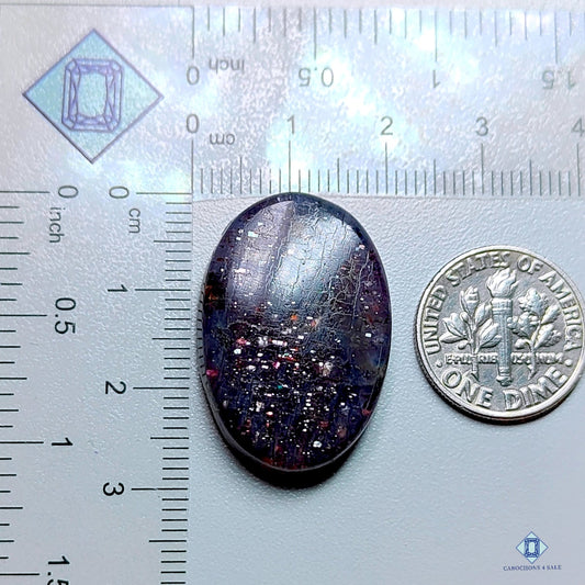 Real Iolite Sunstone should show a blend of blue, purple, and gold hues, along with a noticeable shimmering effect. It needs to have clear visibility and transparency.