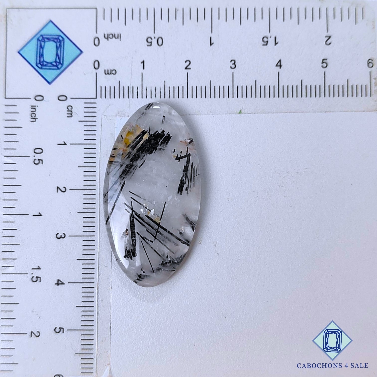 Swipe images to see stone with Dimension chart. This is a Black Rutile Quartz gemstone. The Product is a natural , Oval, Transparent. Black Rutile Quartz gemstone in Colorless color with the size of 40*21*4mm. Clarity of this Black Rutile Quartz Piece is Transparent. The Product is available exactly same shown in the picture: 1 piece Oval Cabochons Black Rutile Quartz certified for the price listed above.