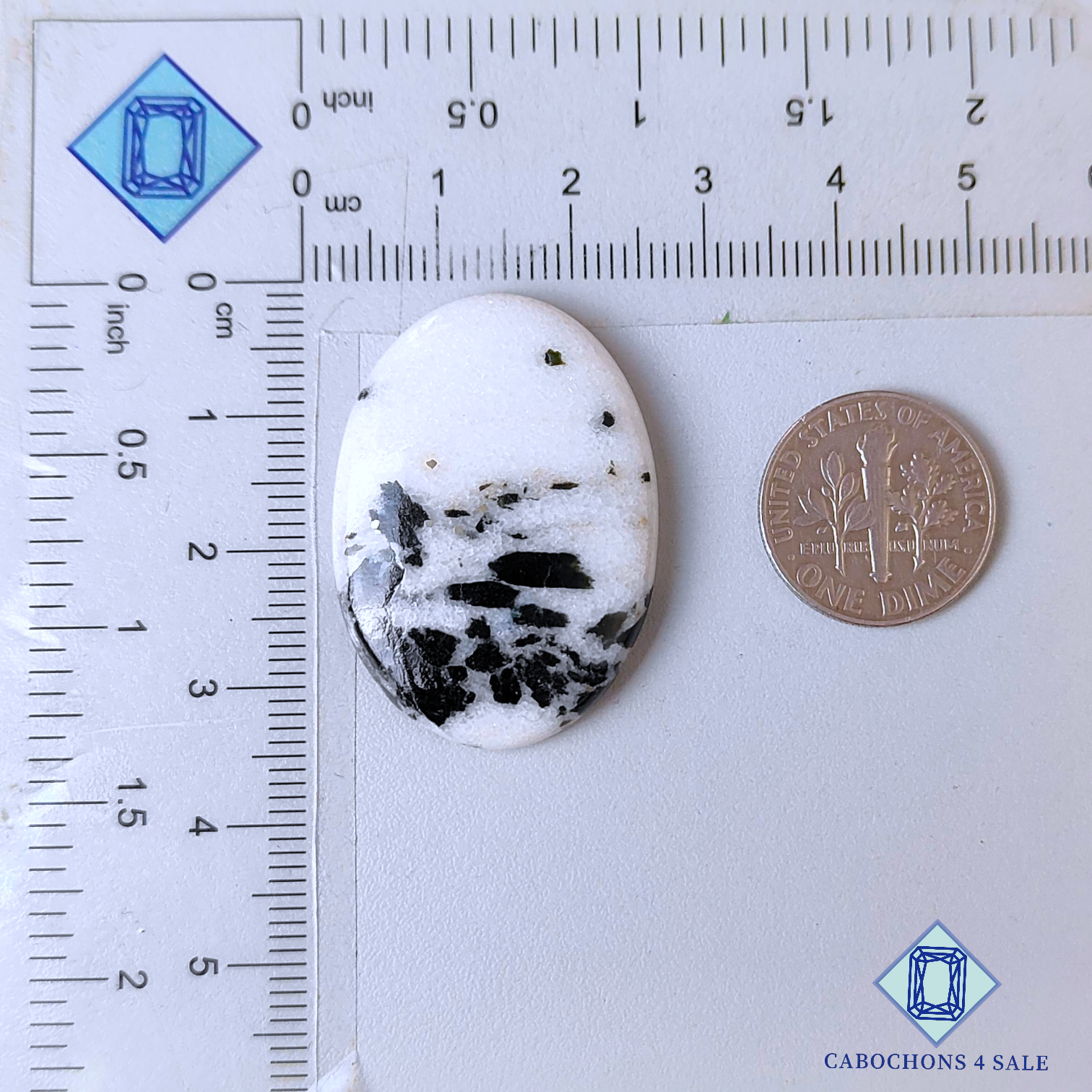 Swipe images to see stone with Dimension chart. This is a Black Dot Agate gemstone. The Product is a natural , Oval, Opaque. Black Dot Agate gemstone in White color with the size of 33*24*5mm. Clarity of this Black Dot Agate Piece is Opaque. The Product is available exactly same shown in the picture: 1 piece Oval Cabochons Black Dot Agate certified for the price listed above.