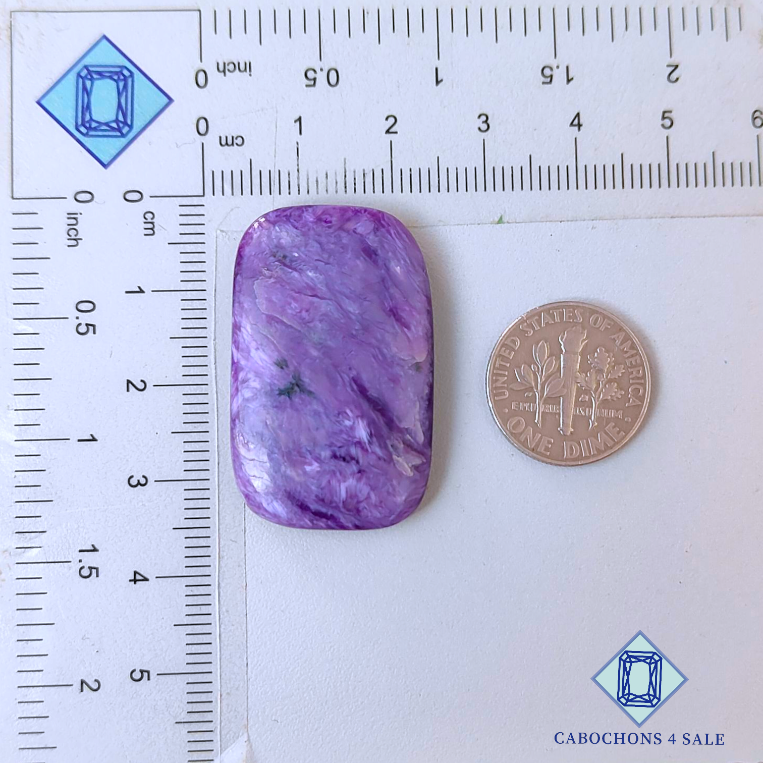 Swipe images to see stone with Dimension chart. This is a Charoite gemstone. The Product is a natural , Fancy, Opaque. Charoite gemstone in Purple color with the size of 34*21*6mm. Clarity of this Charoite Piece is Opaque. The Product is available exactly same shown in the picture: 1 piece Fancy Cabochons Charoite certified for the price listed above.