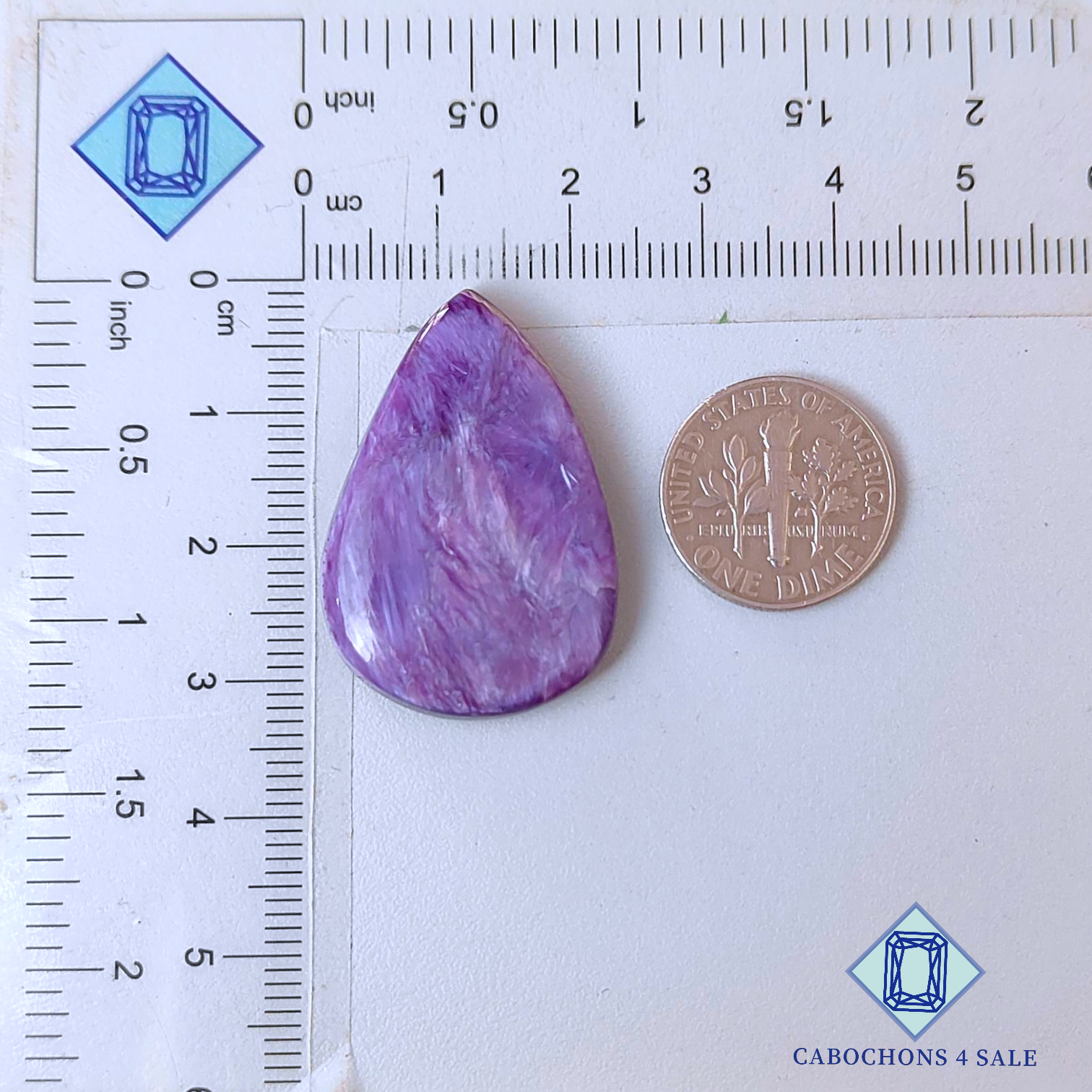 Swipe images to see stone with Dimension chart. This is a Charoite gemstone. The Product is a natural , Pear, Opaque. Charoite gemstone in Purple color with the size of 32*22*6mm. Clarity of this Charoite Piece is Opaque. The Product is available exactly same shown in the picture: 1 piece Pear Cabochons Charoite certified for the price listed above.