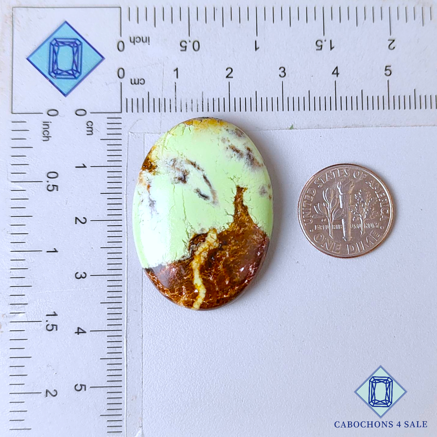Swipe images to see stone with Dimension chart. This is a Citron Chrysoprase gemstone. The Product is a natural , Oval, Opaque. Citron Chrysoprase gemstone in Green color with the  size of 35*25*7mm. Clarity of this Citron Chrysoprase Piece is  Opaque. The Product is available exactly same shown in the picture: 1 piece Oval Cabochons Citron Chrysoprase certified for the price listed above.