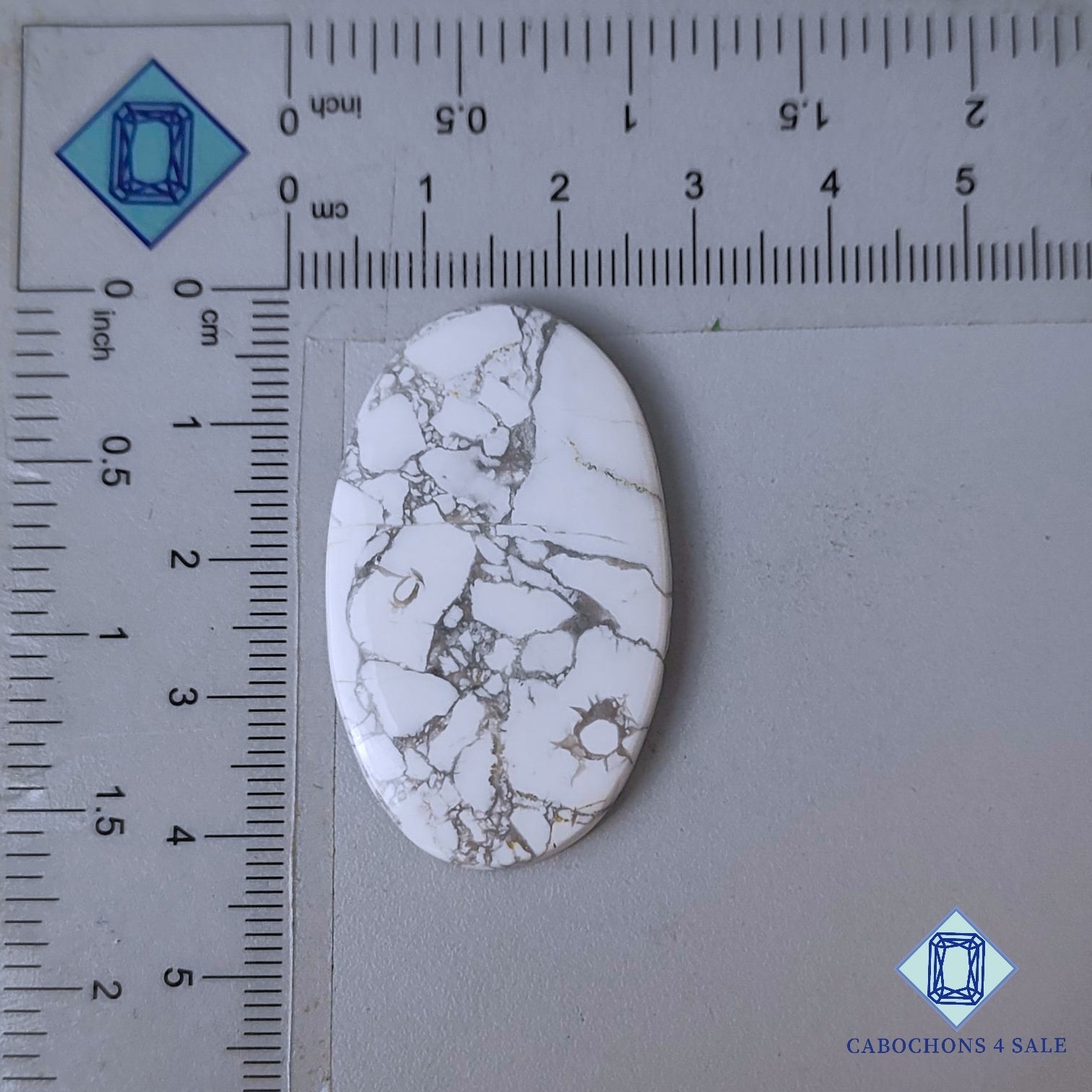 Swipe images to see stone with Dimension chart. This is a Howlite gemstone. The Product is a natural , Oval, Opaque. Howlite gemstone in White color with the size of 41*25*4mm. Clarity of this Howlite Piece is Opaque. The Product is available exactly same shown in the picture: 1 piece Oval Cabochons Howlite certified for the price listed above.
