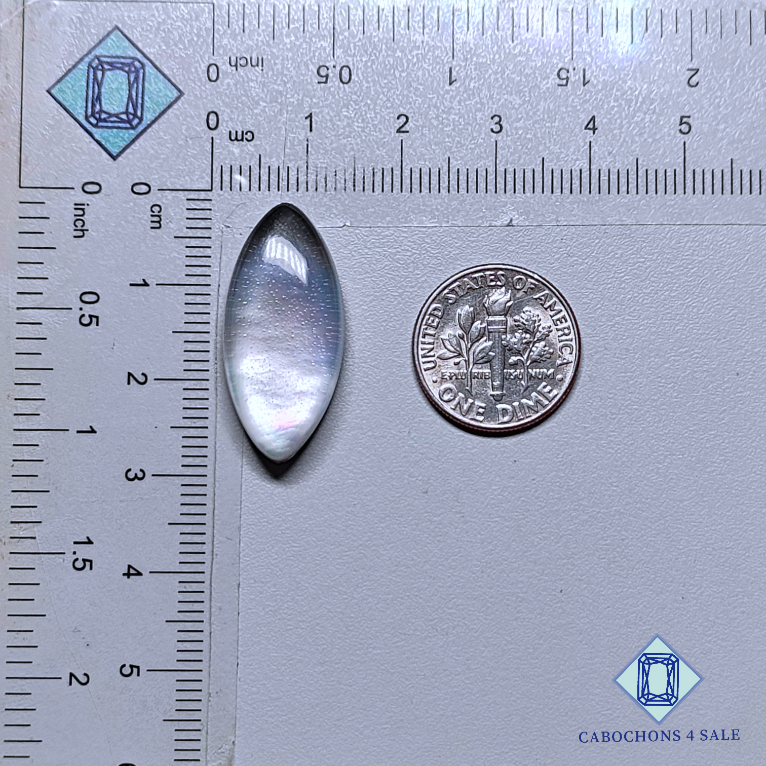 Swipe images to see stone with Dimension chart. This is a Mother of Pearl + Crystal Quartz Doublet gemstone. The Product is a natural , Marquise, Doublets. Mother of Pearl + Crystal Quartz Doublet gemstone in White color with the size of 27*12*7mm. Clarity of this Mother of Pearl + Crystal Quartz Doublet Piece is Doublets. The Product is available exactly same shown in the picture: 1 piece Marquise Doublets Mother of Pearl + Crystal Quartz Doublet certified for the price listed above.