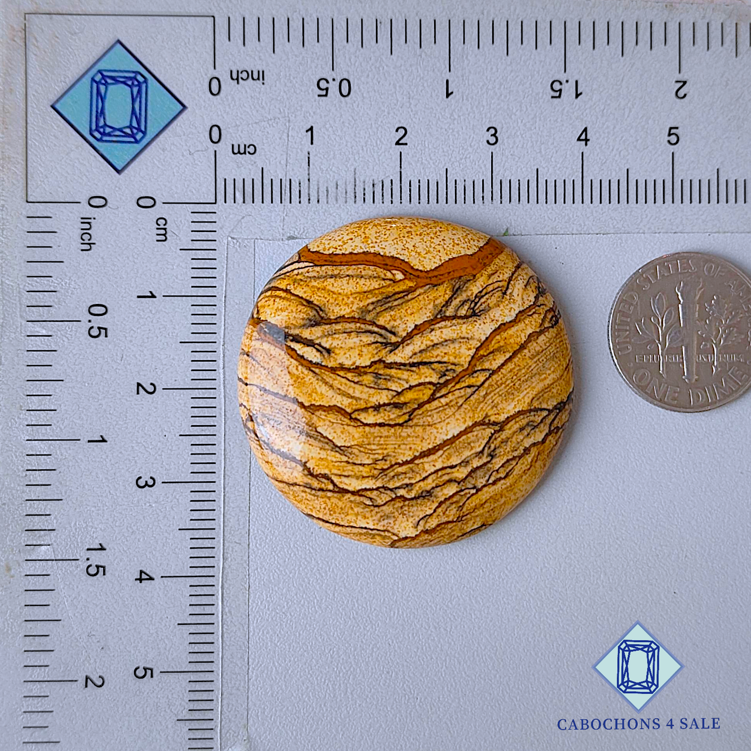 Swipe images to see stone with Dimension chart. This is a Picture Jasper gemstone. The Product is a natural , Round, Opaque. Picture Jasper gemstone in Brown color with the size of 36*5mm. Clarity of this Picture Jasper Piece is Opaque. The Product is available exactly same shown in the picture: 1 piece Round Cabochons Picture Jasper certified for the price listed above.