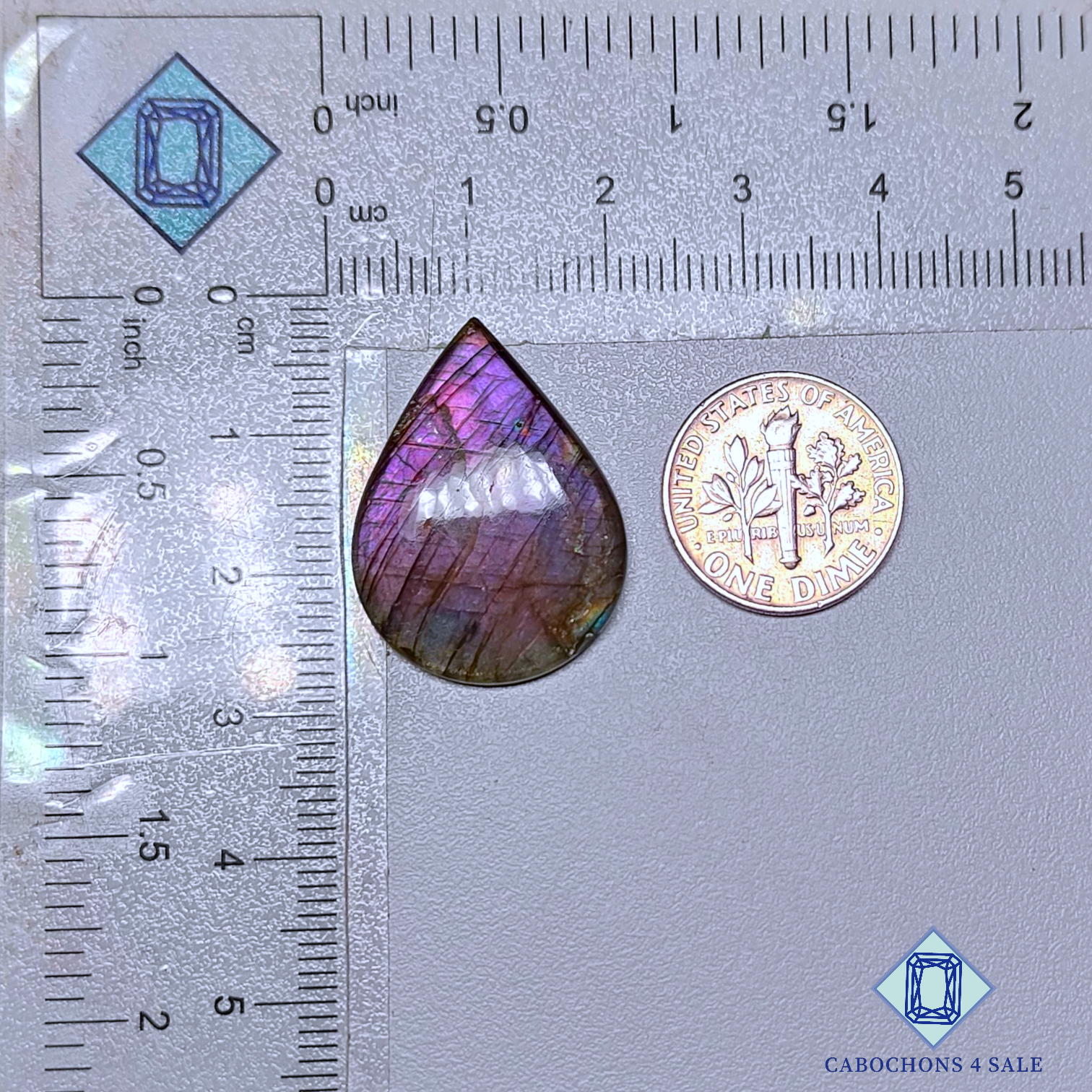 Swipe images to see stone with Dimension chart. This is a Purple Labradorite gemstone. The Product is a natural, Pear, Translucent. Purple Labradorite gemstone in Purple color with the size of 26*19*4mm. Clarity of this Purple Labradorite Piece is Translucent. The Product is available exactly same shown in the picture: 1 piece Pear Cabochons Purple Labradorite certified for the price listed above.