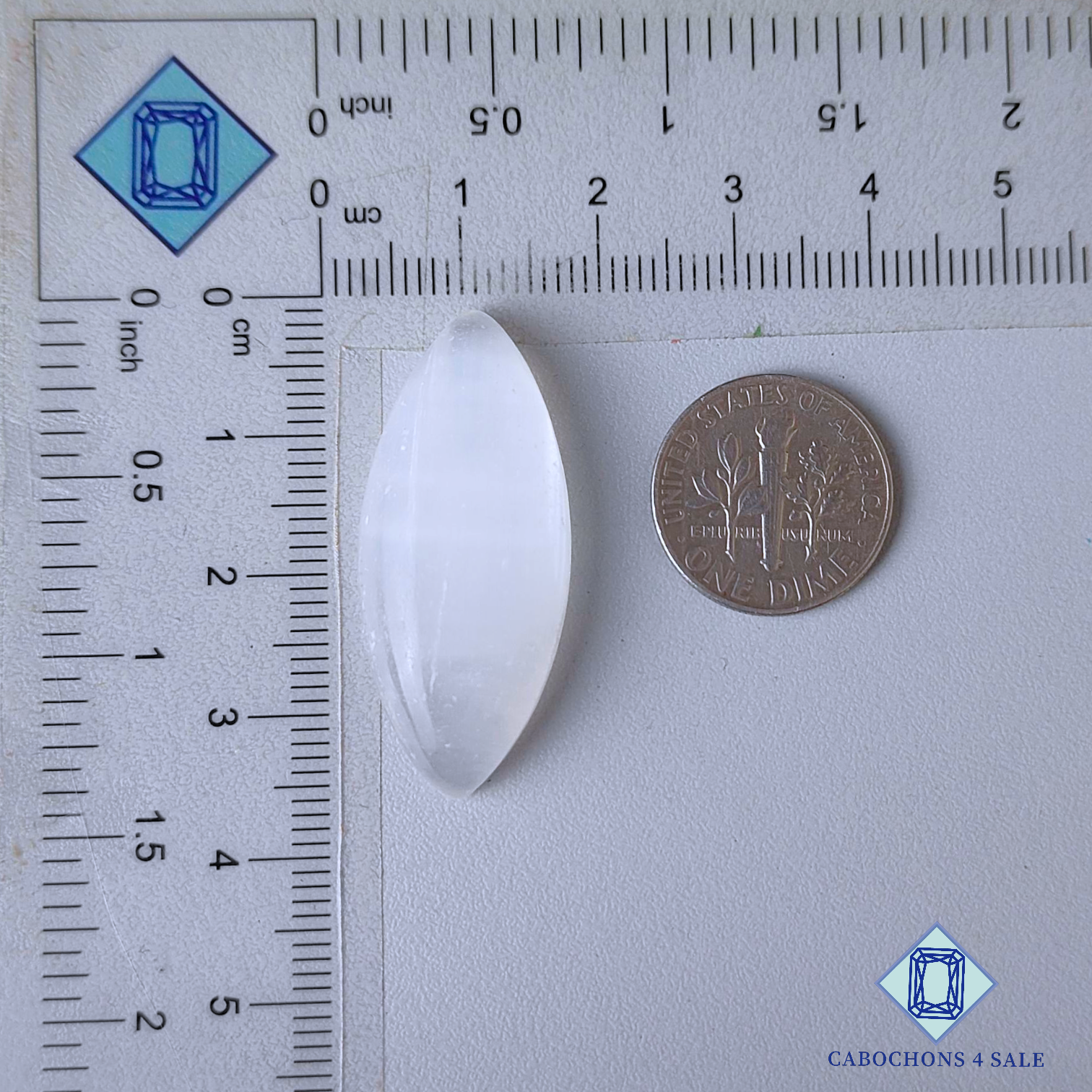 Swipe images to see stone with Dimension chart. This is a Selenite gemstone. The Product is a natural, Marquise, Translucent. Selenite gemstone in White color with the size of 35*15*7mm. Clarity of this Selenite Piece is Translucent. The Product is available exactly same shown in the picture: 1 piece Marquise Cabochons Selenite certified for the price listed above.