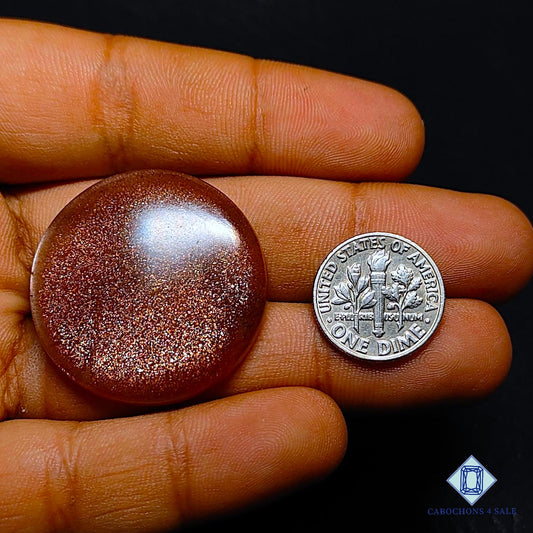 Cabujones redondos de piedra lunar melocotón natural con piedra solar de 32 x 6 mm de Madagascar, disponibles para la venta.