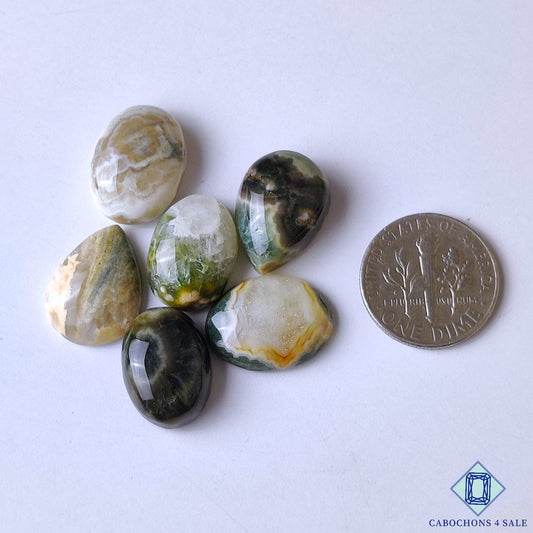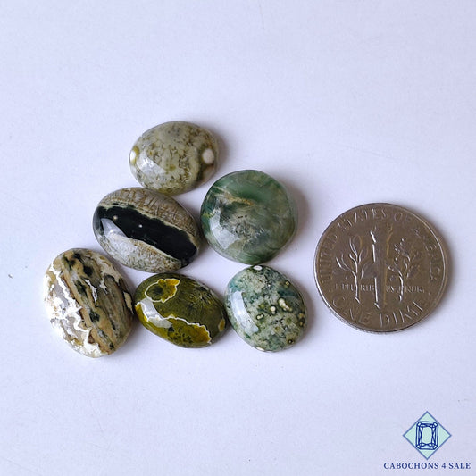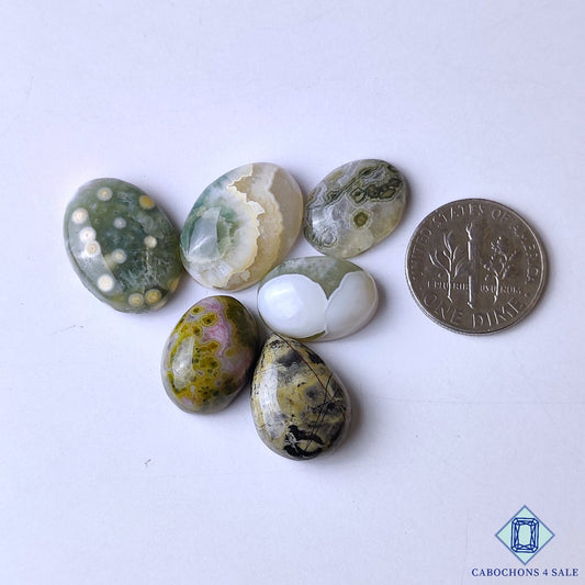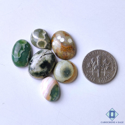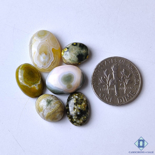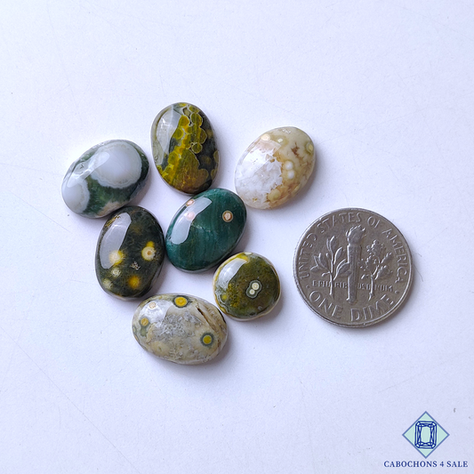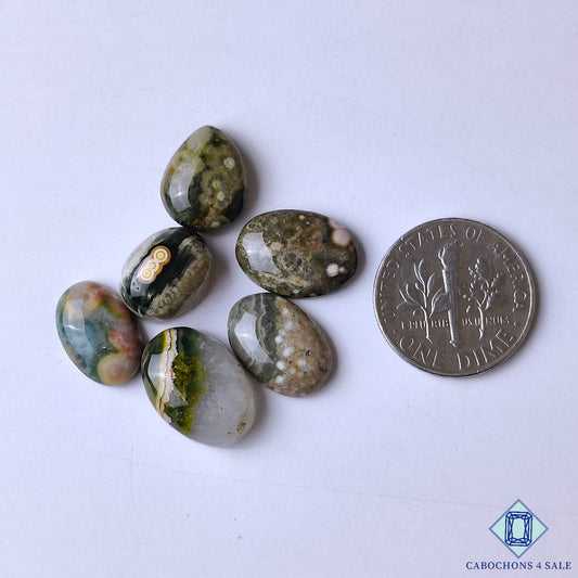 Cabujones ovalados de jaspe oceánico natural de 33 x 23 x 6 mm de Madagascar, disponibles para la venta.