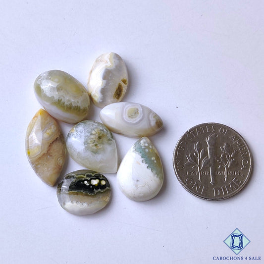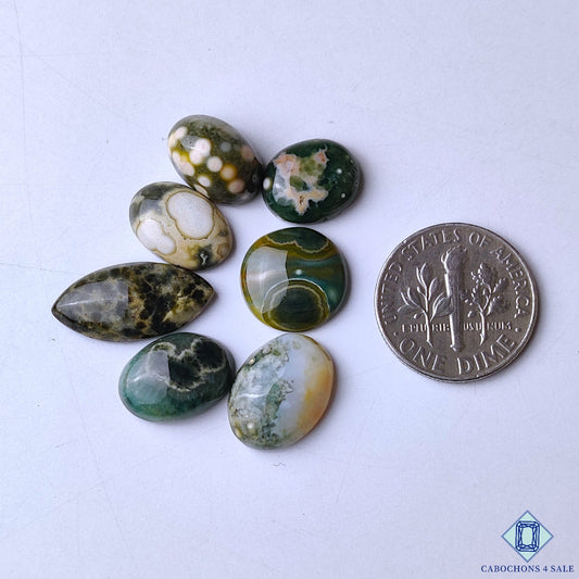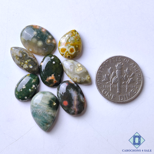 Cabujones ovalados de jaspe oceánico natural de 33 x 18 x 6 mm de Madagascar, disponibles para la venta.