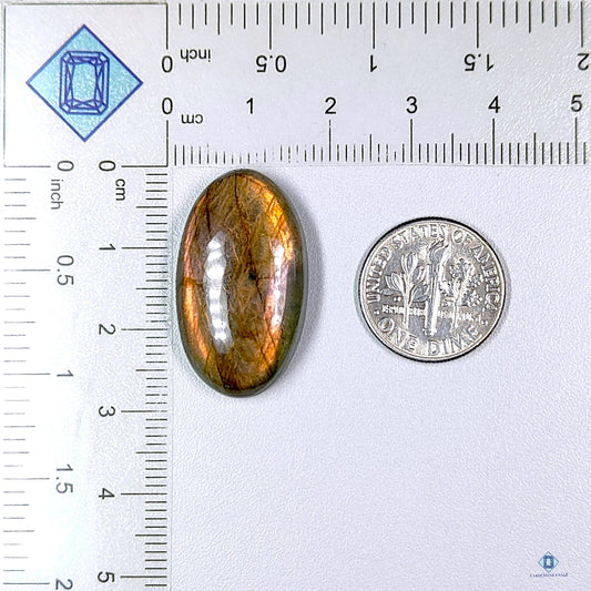 Labradorita amarilla natural tallada en forma ovalada de 26 x 14 x 6 mm de Madagascar, disponible para la venta.
