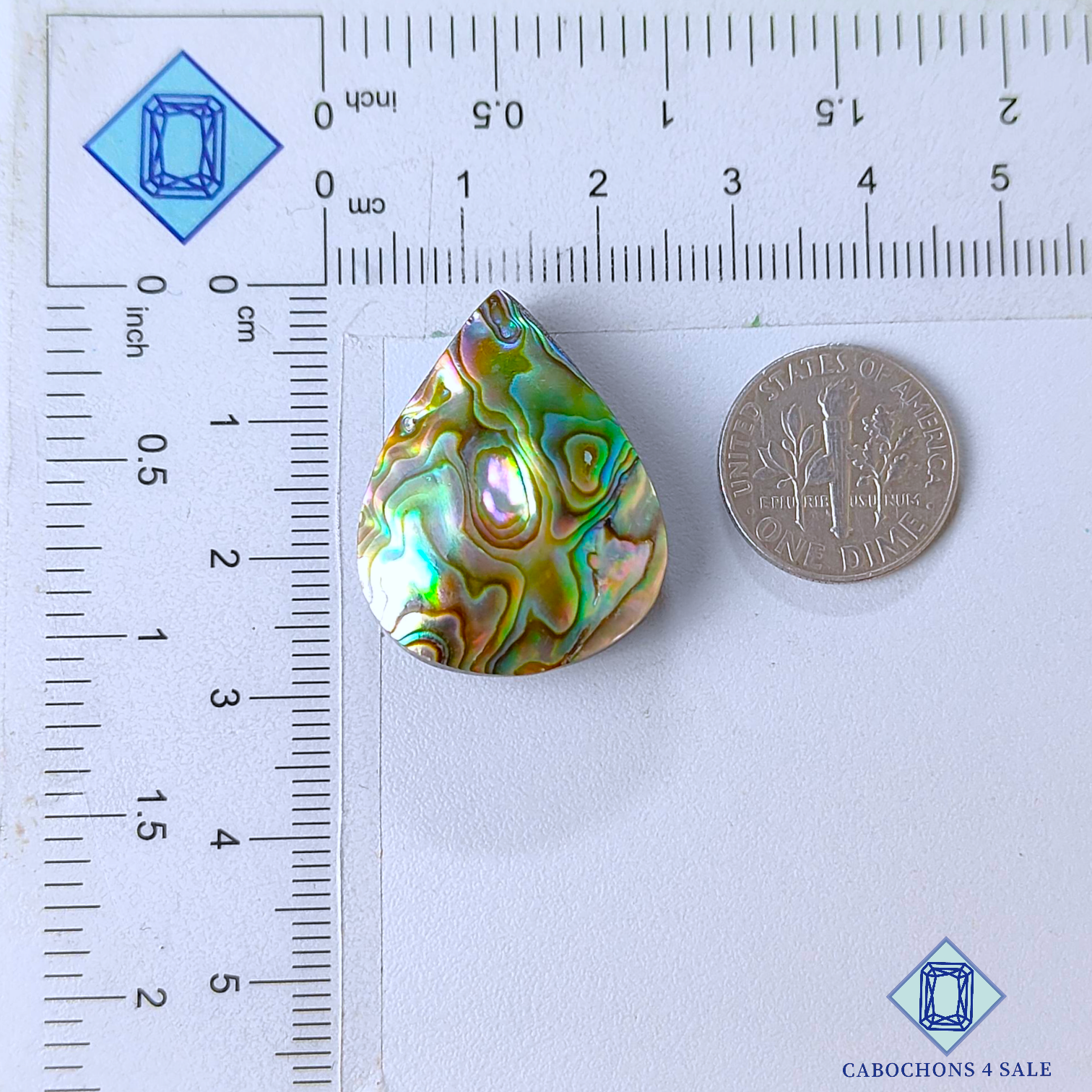 Deslice las imágenes para ver la piedra con la tabla de dimensiones. Esta es una gema de concha de abulón. El producto es natural, de forma pera y opaco. La gema de concha de abulón es verde y mide 27 x 22 x 8 mm. La claridad de esta pieza es opaca. El producto está disponible exactamente como se muestra en la imagen: 1 pieza de cabujones de concha de abulón en forma de pera certificados por el precio indicado anteriormente.