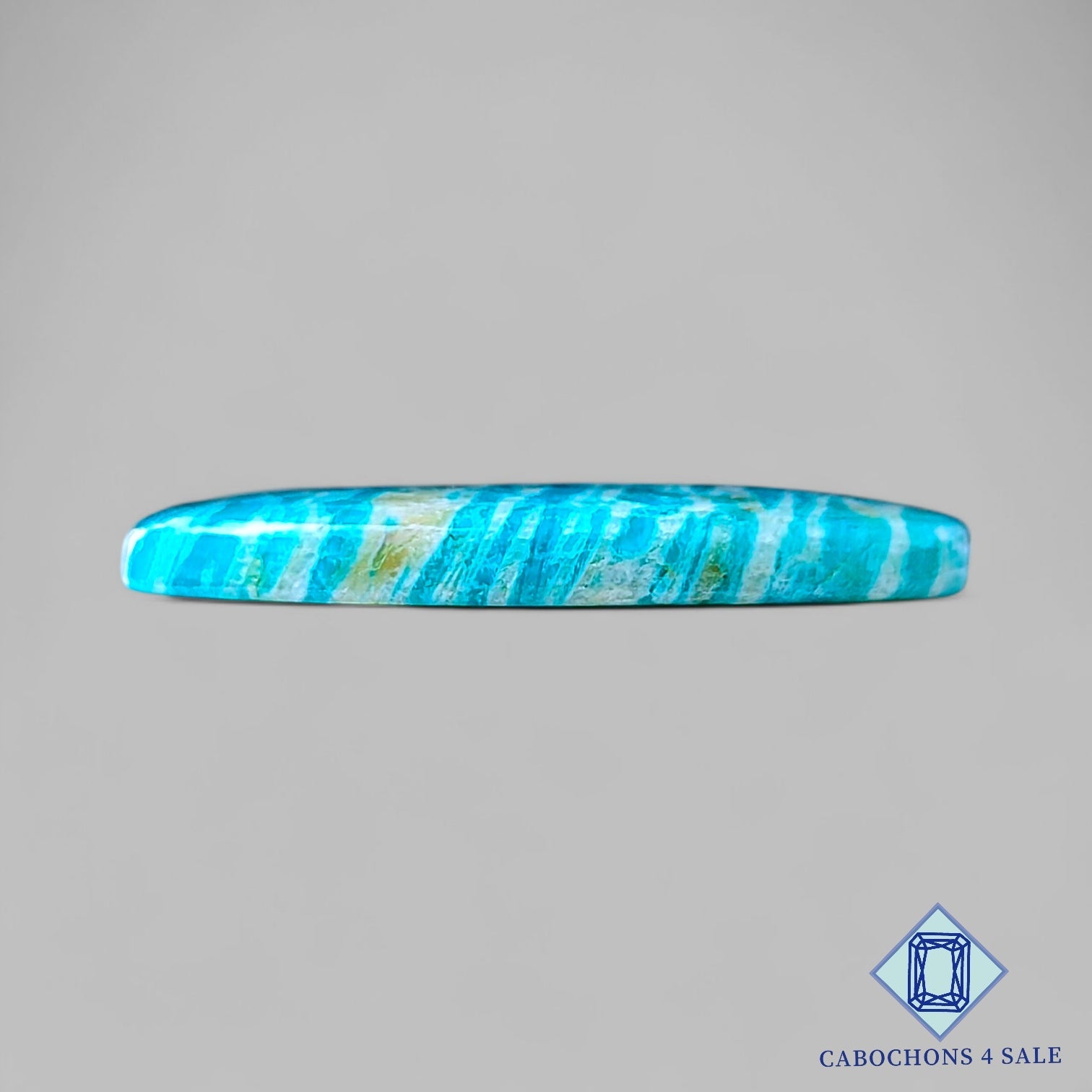 Deslice las imágenes para ver la piedra con la tabla de dimensiones. Esta es una gema de amazonita. El producto es natural, ovalado y opaco. La amazonita es azul y mide 44 x 30 x 5 mm. La claridad de esta pieza es opaca. El producto está disponible exactamente como se muestra en la imagen: 1 cabujón ovalado con certificación de amazonita por el precio indicado anteriormente.