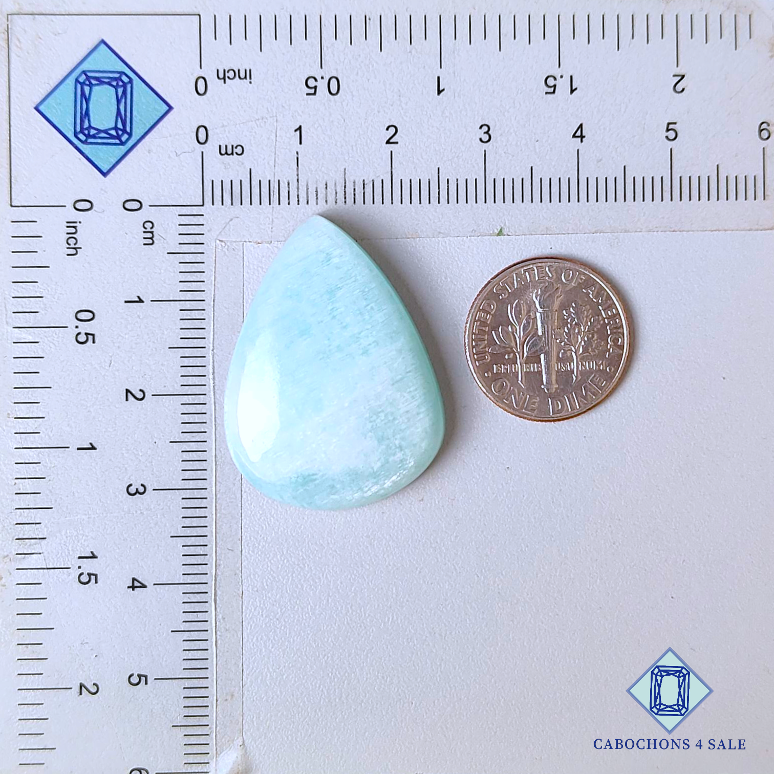 Deslice las imágenes para ver la piedra con la tabla de dimensiones. Esta es una gema de amazonita. El producto es una gema natural, de forma pera y translúcida. La amazonita es de color azul y mide 31 x 23 x 6 mm. La claridad de esta pieza es translúcida. El producto está disponible exactamente como se muestra en la imagen: 1 pieza de cabujones de amazonita de forma pera certificados por el precio indicado anteriormente.
