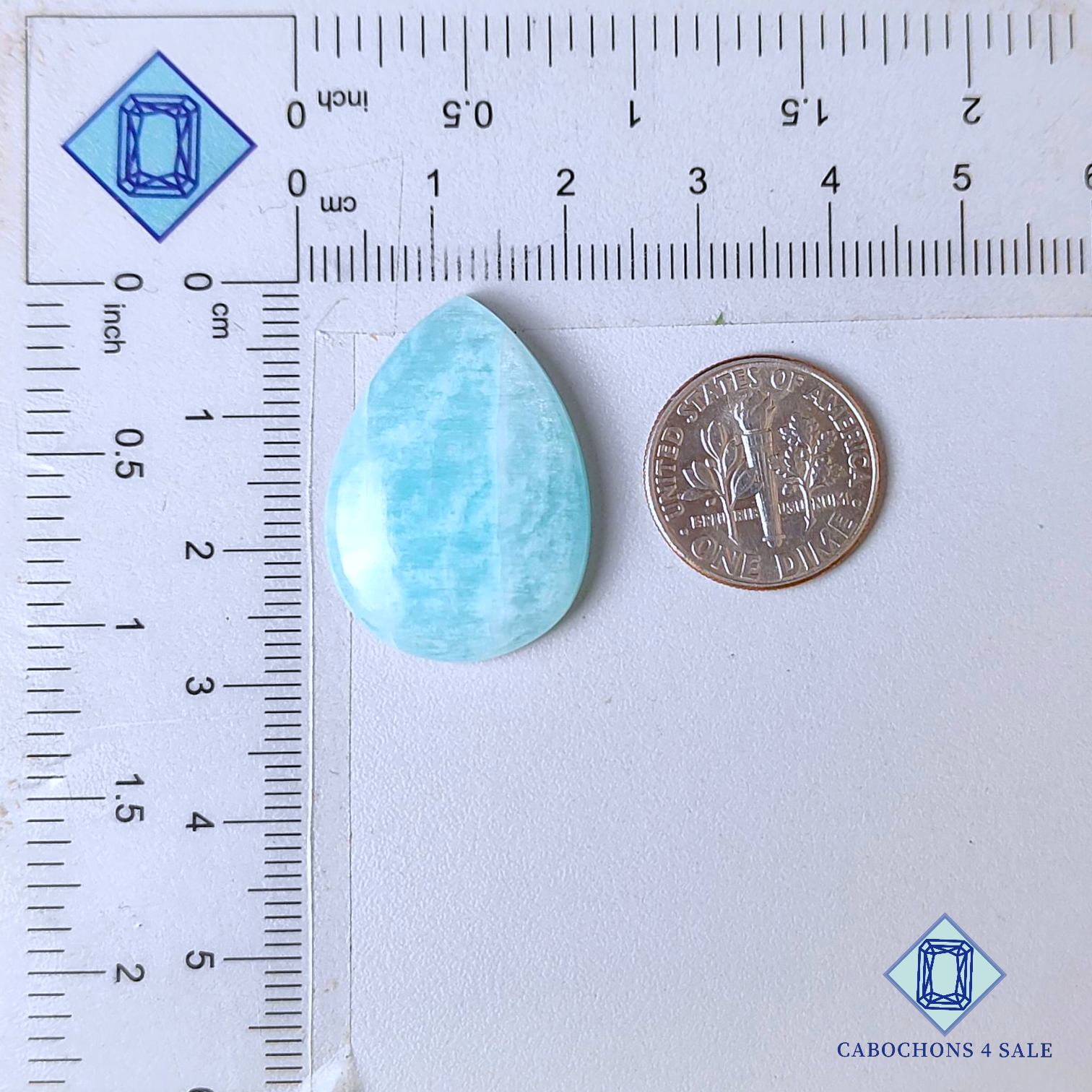 Deslice las imágenes para ver la piedra con la tabla de dimensiones. Esta es una gema de amazonita. El producto es una gema natural, de forma pera y translúcida. La amazonita es de color azul y mide 27 x 19 x 5 mm. La claridad de esta pieza es translúcida. El producto está disponible exactamente como se muestra en la imagen: 1 pieza de cabujones de amazonita con certificación de pera por el precio indicado anteriormente.