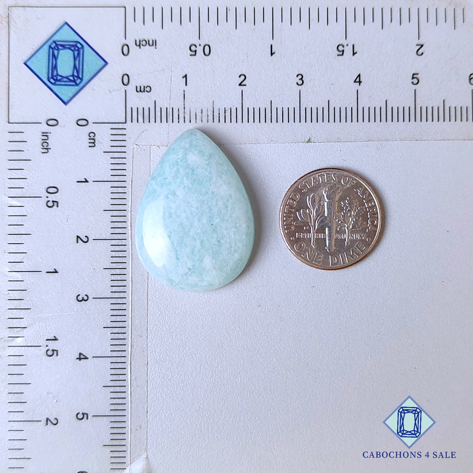 Deslice las imágenes para ver la piedra con la tabla de dimensiones. Esta es una gema de amazonita. El producto es una gema natural, de forma pera y translúcida. La amazonita es de color azul y mide 28 x 20 x 6 mm. La claridad de esta pieza es translúcida. El producto está disponible exactamente como se muestra en la imagen: 1 pieza de cabujones de amazonita de forma pera certificados por el precio indicado anteriormente.