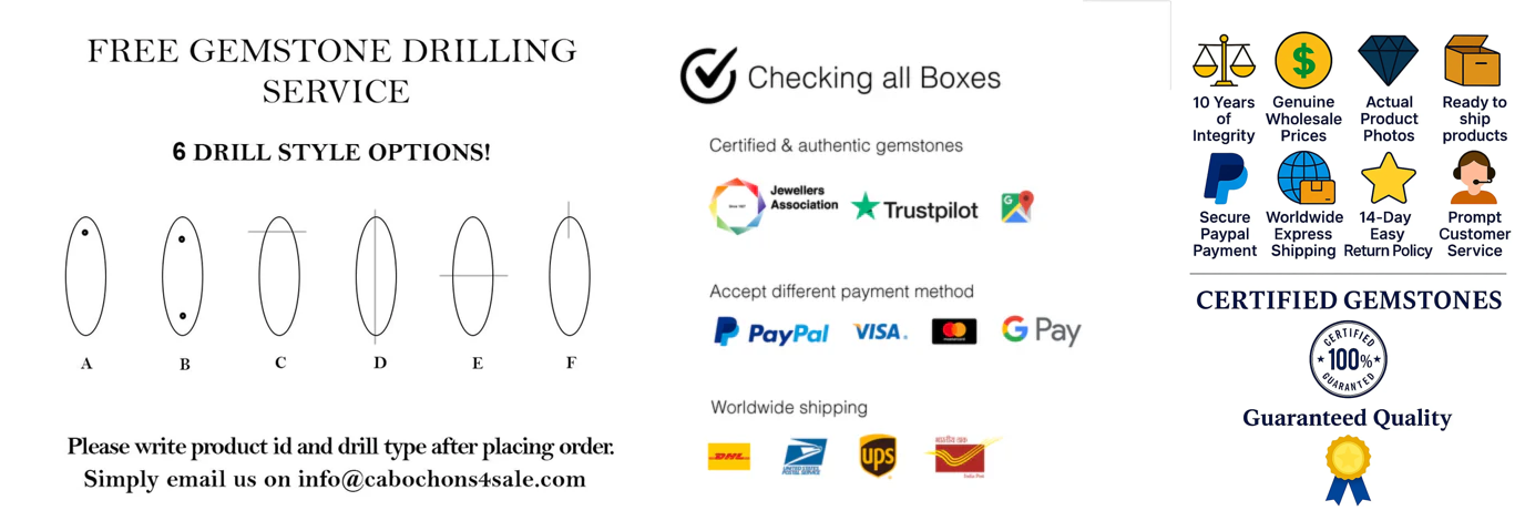 Cabochons4sale no se responsabiliza de los aranceles ni impuestos aplicados a su pedido. Todos los cargos aplicados durante o después del envío son responsabilidad del cliente (aranceles, impuestos, etc.).