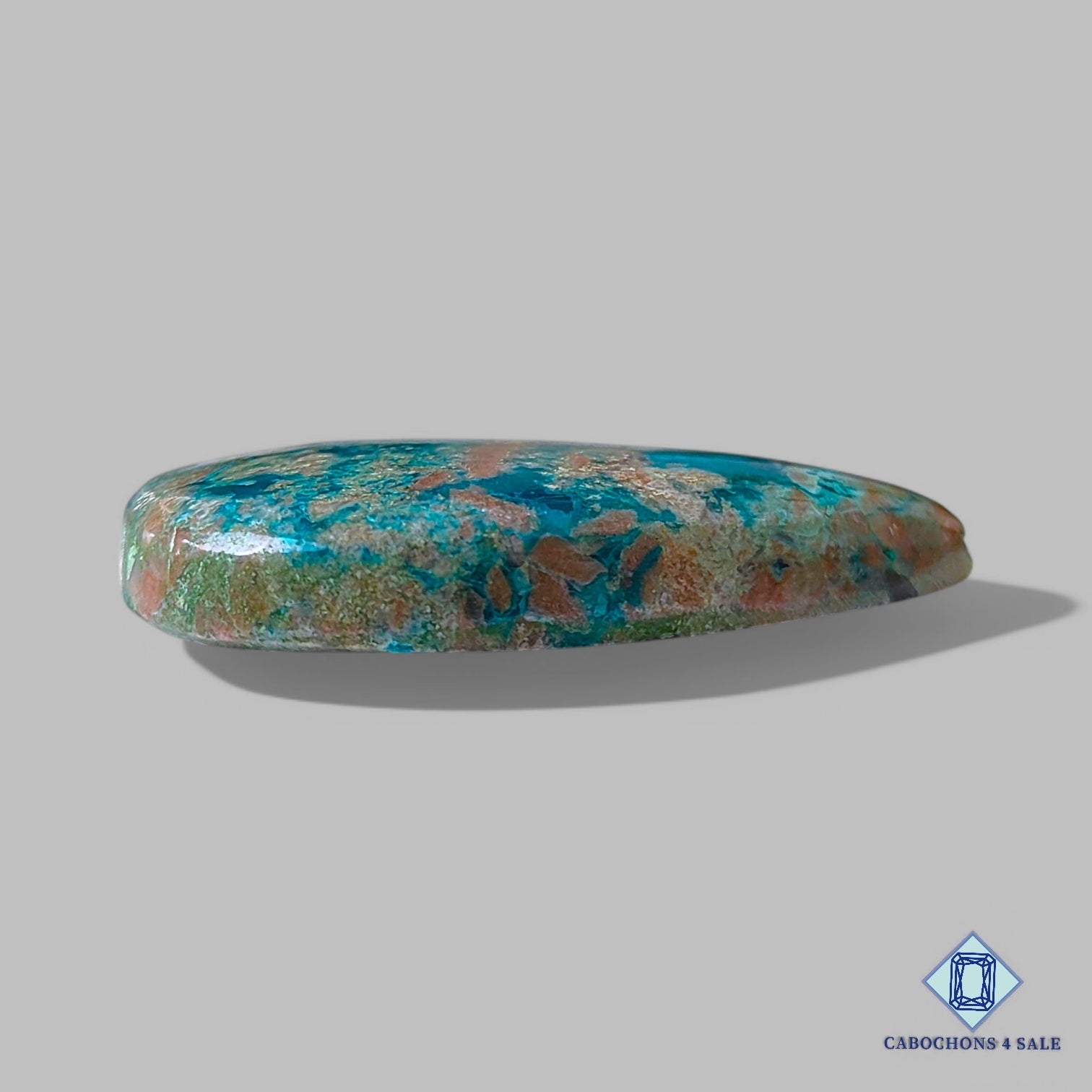 Deslice las imágenes para ver la piedra con la tabla de dimensiones. Esta es una gema de azurita crisocola. El producto es natural, de forma pera y opaco. La gema de azurita crisocola es de color verde y mide 37 x 27 x 7 mm. La claridad de esta pieza es opaca. El producto está disponible exactamente como se muestra en la imagen: 1 pieza de cabujones de azurita crisocola en forma de pera certificados por el precio indicado anteriormente.