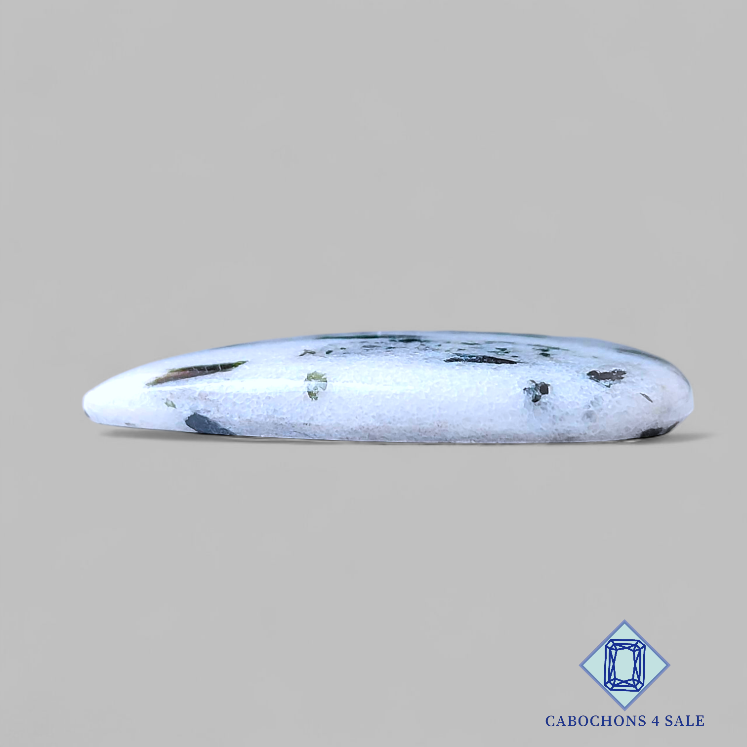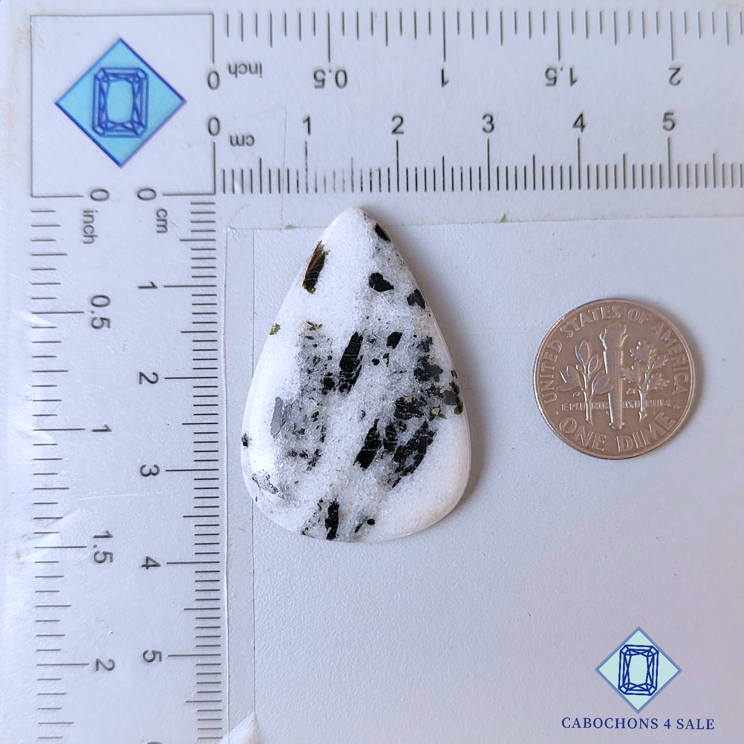 Deslice las imágenes para ver la piedra con la tabla de dimensiones. Esta es una gema de ágata de punto negro. El producto es una gema natural de ágata de punto negro opaca, de color blanco, con un tamaño de 36 x 24 x 5 mm. La claridad de esta pieza de ágata de punto negro es opaca. El producto está disponible exactamente como se muestra en la imagen: 1 pieza de cabujones de ágata de punto negro con certificación al precio indicado anteriormente.