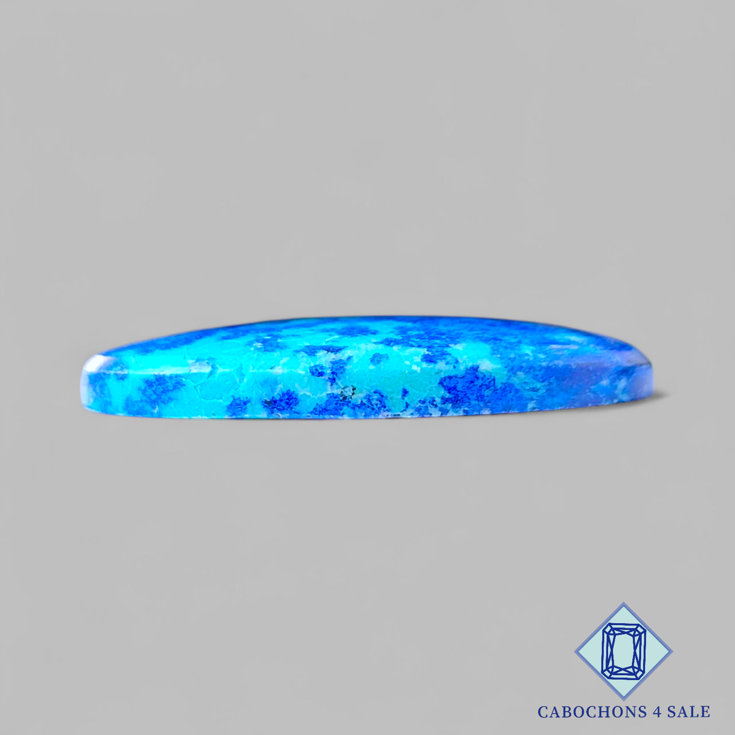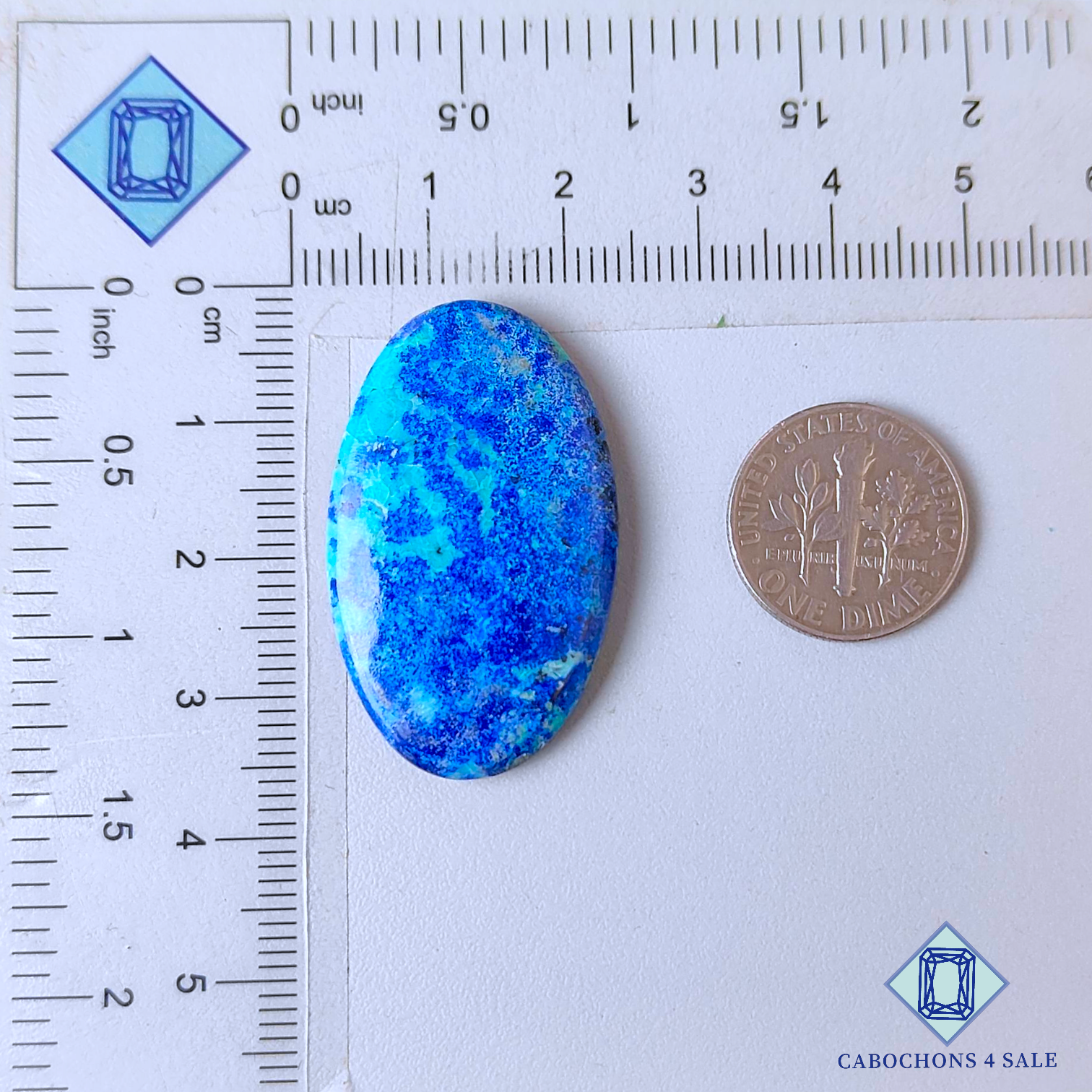 Deslice las imágenes para ver la piedra con la tabla de dimensiones. Esta es una gema de azurita Blue Bird. El producto es natural, ovalado y opaco. La azurita Blue Bird es de color azul y mide 34 x 21 x 5 mm. La claridad de esta pieza es opaca. El producto está disponible exactamente como se muestra en la imagen: 1 pieza de cabujones ovalados de azurita Blue Bird certificados por el precio indicado anteriormente.