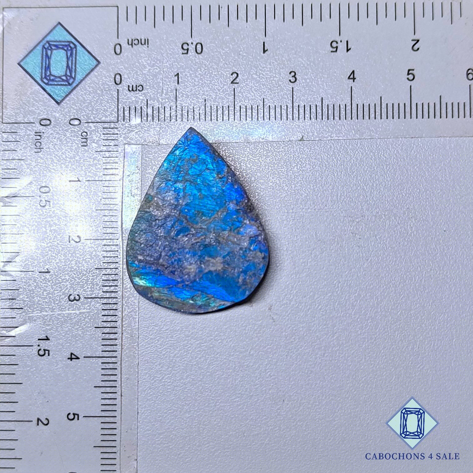 Deslice las imágenes para ver la piedra con la tabla de dimensiones. Esta es una labradorita azul. El producto es natural, de forma pera y translúcida. La labradorita azul es de color azul y mide 30 x 23 x 6 mm. La claridad de esta labradorita azul es translúcida. El producto está disponible exactamente como se muestra en la imagen: 1 labradorita azul drusa pera certificada por el precio indicado anteriormente.