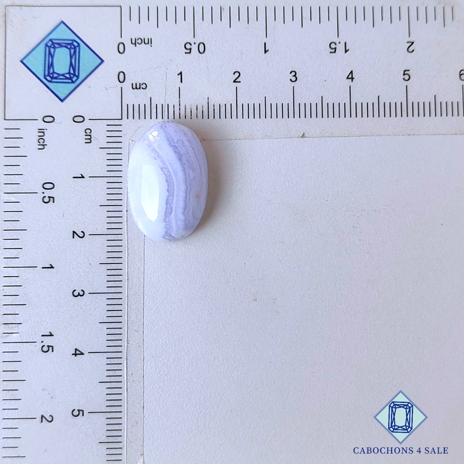 Deslice las imágenes para ver la piedra con la tabla de dimensiones. Esta es una gema de ágata de encaje azul. El producto es una gema natural, ovalada y opaca de color azul con un tamaño de 20 x 14 x 8 mm. La claridad de esta pieza de ágata de encaje azul es opaca. El producto está disponible exactamente como se muestra en la imagen: 1 pieza de cabujones ovalados de ágata de encaje azul certificados por el precio indicado anteriormente.