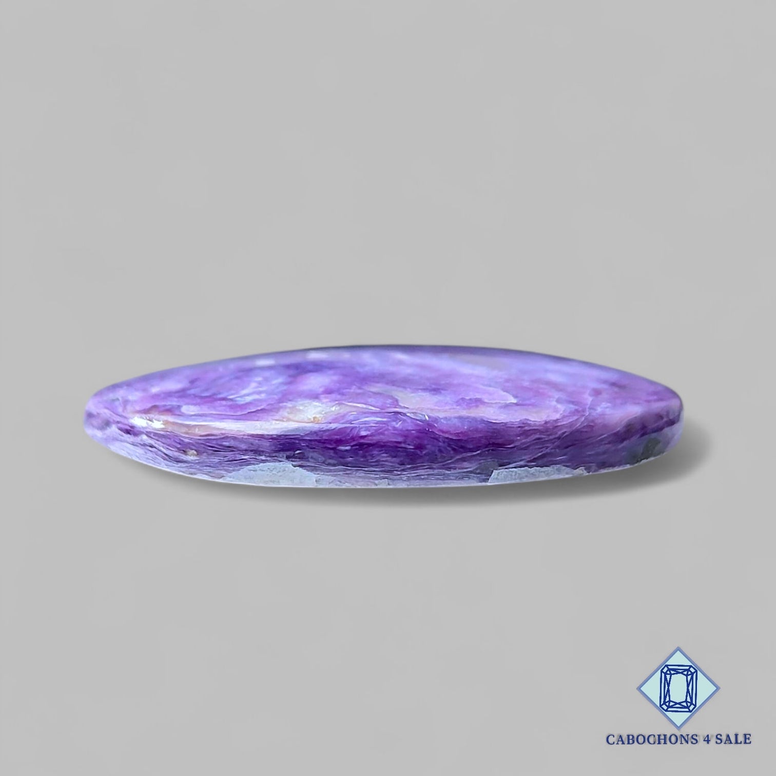 Deslice las imágenes para ver la piedra con la tabla de dimensiones. Esta es una gema de charoíta. El producto es natural, ovalado y opaco. La charoíta es de color púrpura y mide 39 x 29 x 6 mm. La claridad de esta pieza es opaca. El producto está disponible exactamente como se muestra en la imagen: 1 pieza de cabujones ovalados de charoíta certificados por el precio indicado anteriormente.