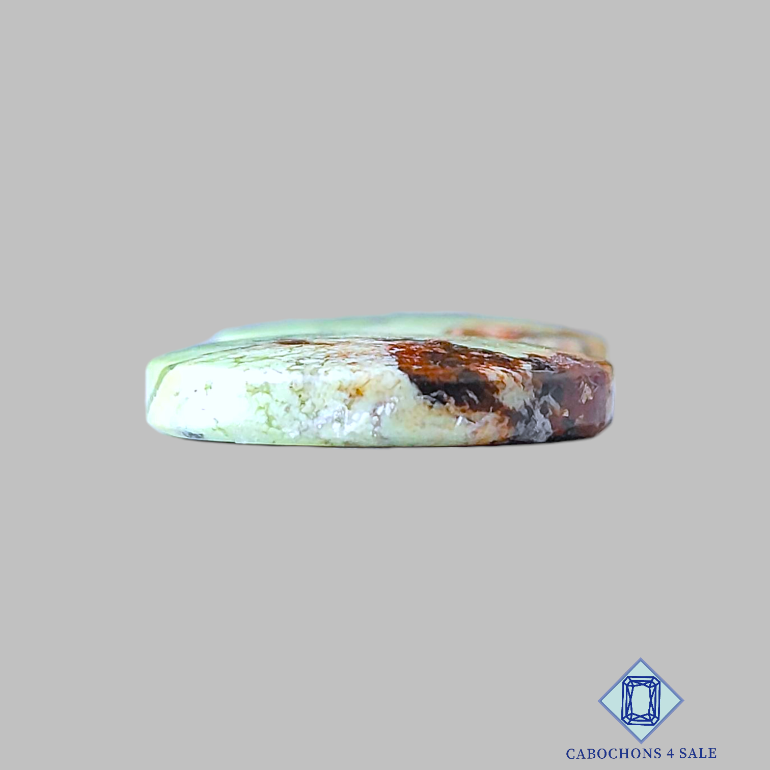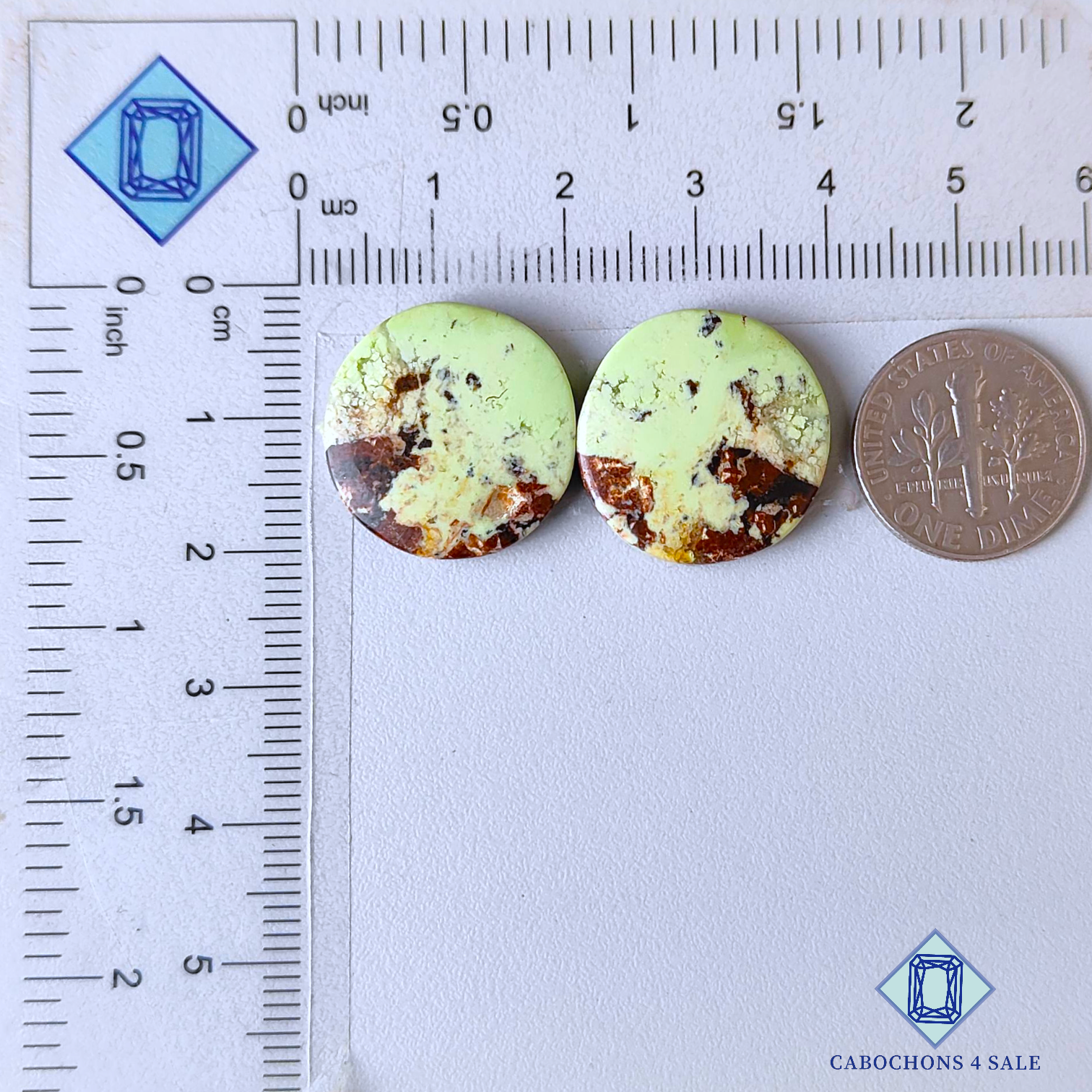 Deslice las imágenes para ver la piedra con la tabla de dimensiones. Esta es una gema de crisoprasa citrina. El producto es natural, redondo y opaco. La crisoprasa citrina es verde y mide 19 x 4 mm. La claridad de esta pieza es opaca. El producto está disponible exactamente como se muestra en la imagen: 1 par de crisoprasas citrinas redondas certificadas por el precio indicado anteriormente.