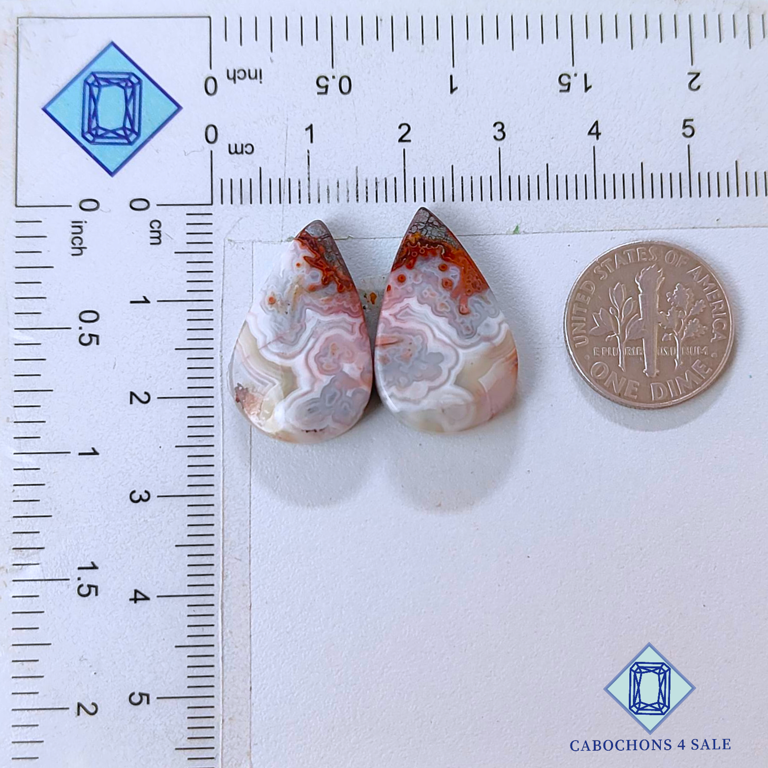 Deslice las imágenes para ver la piedra con la tabla de dimensiones. Esta es una gema de ágata Crazy Lace. El producto es natural, de forma pera y opaco. Es de color gris y mide 23 x 14 x 4 mm. La claridad de esta pieza es opaca. El producto está disponible exactamente como se muestra en la imagen: 1 par de ágatas Crazy Lace certificadas por el precio indicado anteriormente.