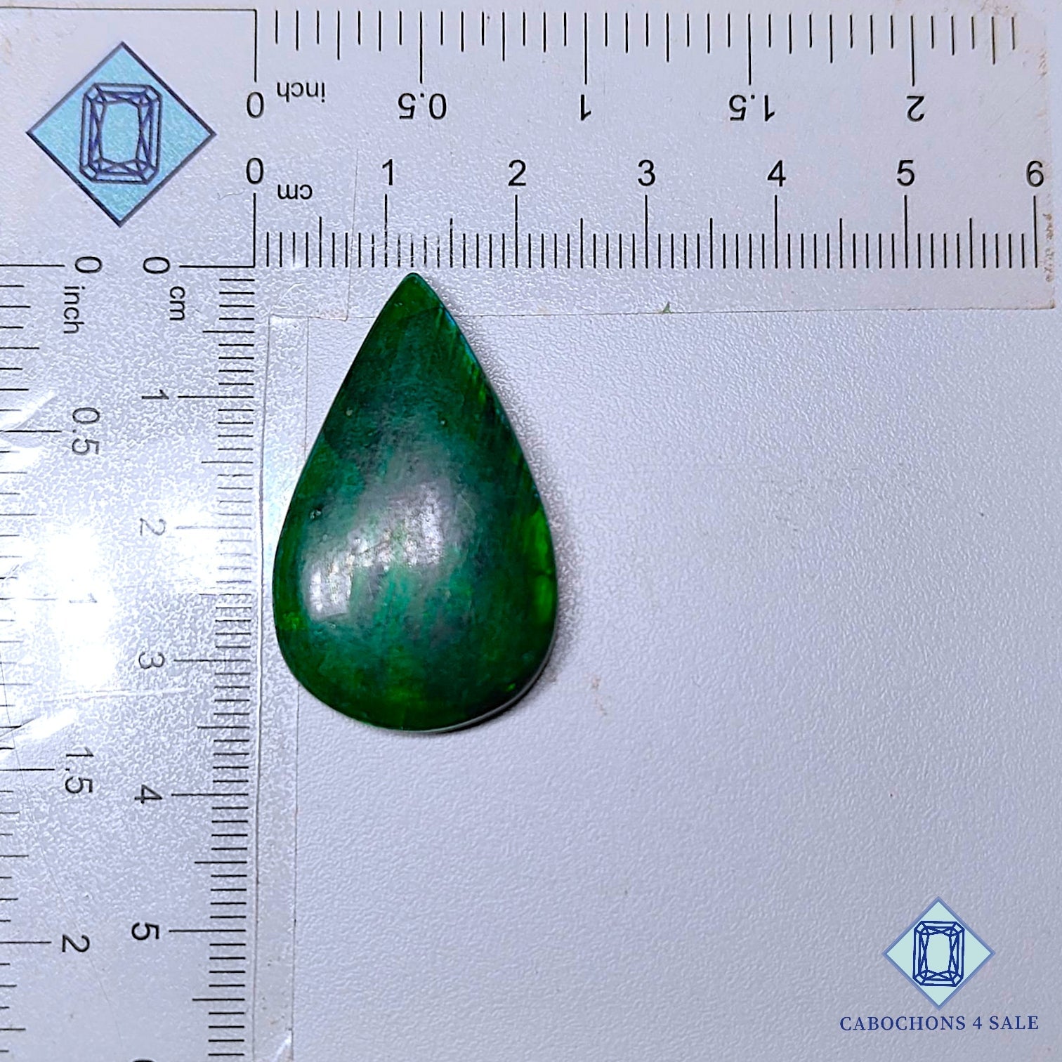 Deslice las imágenes para ver la piedra con la tabla de dimensiones. Esta es una labradorita verde teñida. El producto es una labradorita verde teñida natural, translúcida, de color verde, con un tamaño de 34 x 21 x 5 mm. La claridad de esta labradorita verde teñida es translúcida. El producto está disponible exactamente como se muestra en la imagen: 1 cabujón de labradorita verde teñida con certificación de pera, certificado por el precio indicado anteriormente.