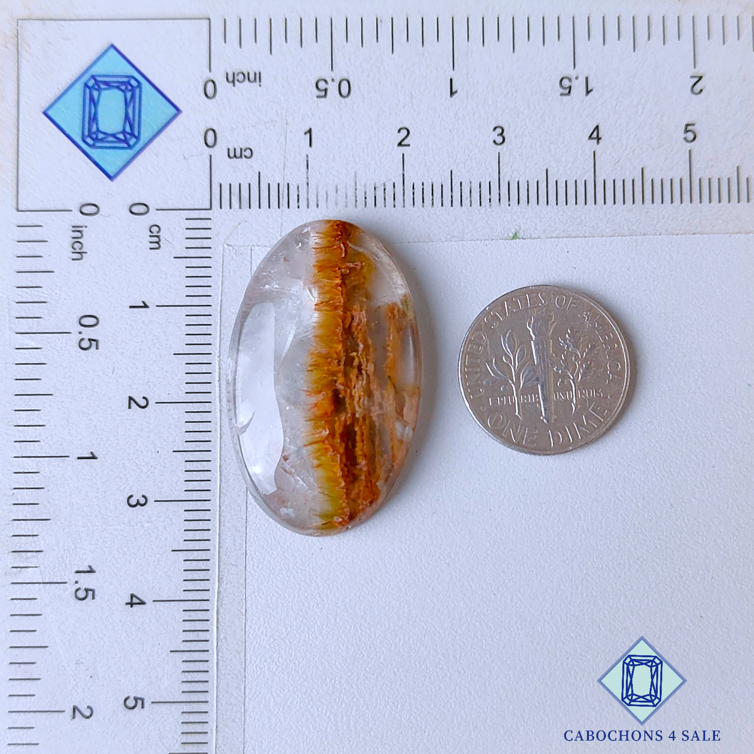 Deslice las imágenes para ver la piedra con la tabla de dimensiones. Esta es una gema de cuarzo rutilado cacoxenita verde. El producto es natural, ovalado y translúcido. El cuarzo rutilado cacoxenita verde es marrón y mide 32 x 20 x 5 mm. La claridad de esta pieza es translúcida. El producto está disponible exactamente como se muestra en la imagen: 1 pieza de cabujones ovalados de cuarzo rutilado cacoxenita verde, certificada por el precio indicado anteriormente.