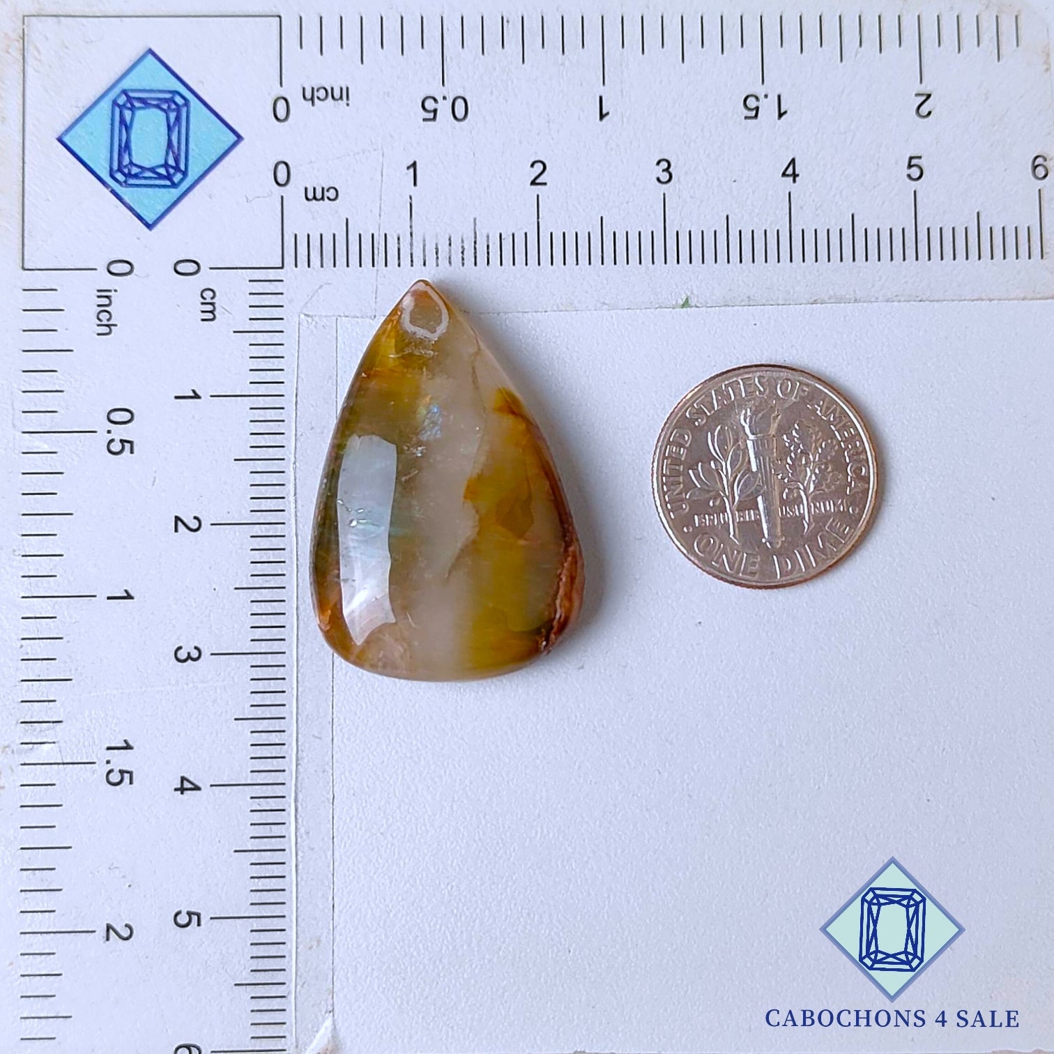 Deslice las imágenes para ver la piedra con la tabla de dimensiones. Esta es una gema de cuarzo rutilado cacoxenita verde. El producto es una gema natural de cuarzo rutilado cacoxenita verde, de forma pera y translúcida. Es de color verde y mide 31 x 21 x 7 mm. La claridad de esta pieza es translúcida. El producto está disponible exactamente como se muestra en la imagen: 1 pieza de cabujones de cuarzo rutilado cacoxenita verde, certificada por el precio indicado anteriormente.