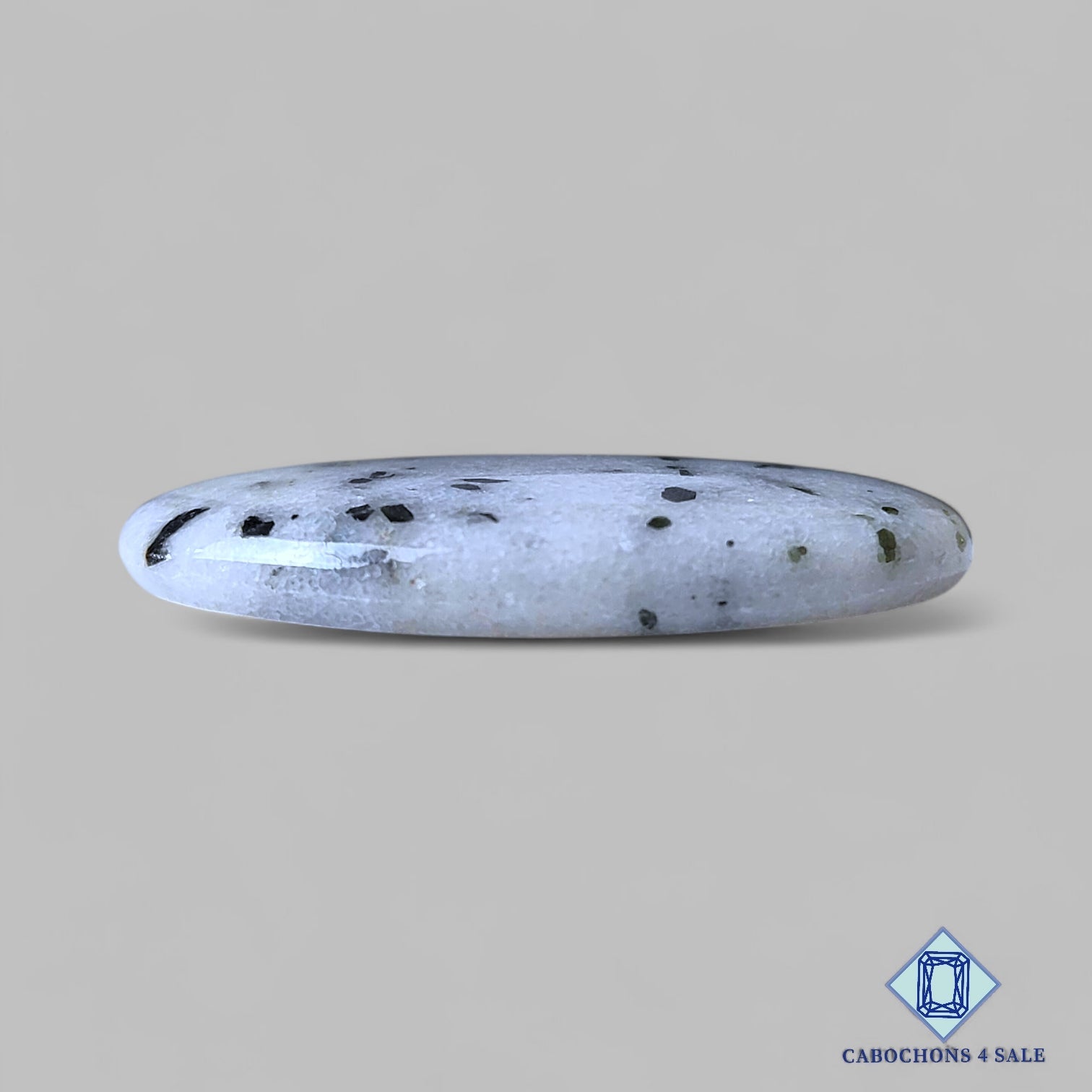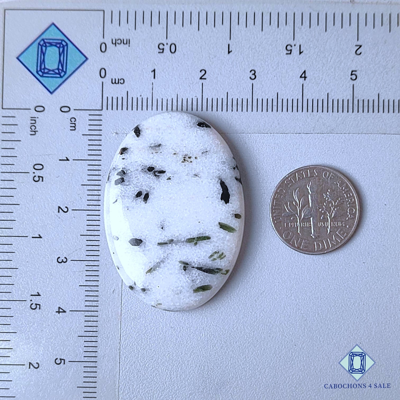 Deslice las imágenes para ver la piedra con la tabla de dimensiones. Esta es una gema de turmalina Green Dot. El producto es una gema natural, ovalada y opaca. Es de color blanco y mide 39 x 28 x 5 mm. La claridad de esta pieza es opaca. El producto está disponible exactamente como se muestra en la imagen: 1 cabujón ovalado con certificación Green Dot por el precio indicado anteriormente.