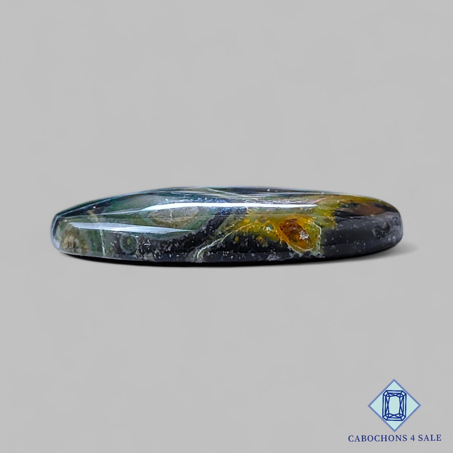 Deslice las imágenes para ver la piedra con la tabla de dimensiones. Esta es una gema de jaspe Kambaba. El producto es natural, ovalado y opaco. El jaspe Kambaba es de color negro y mide 34 x 23 x 5 mm. La claridad de esta pieza es opaca. El producto está disponible exactamente como se muestra en la imagen: 1 pieza de cabujones ovalados de jaspe Kambaba certificados por el precio indicado anteriormente.