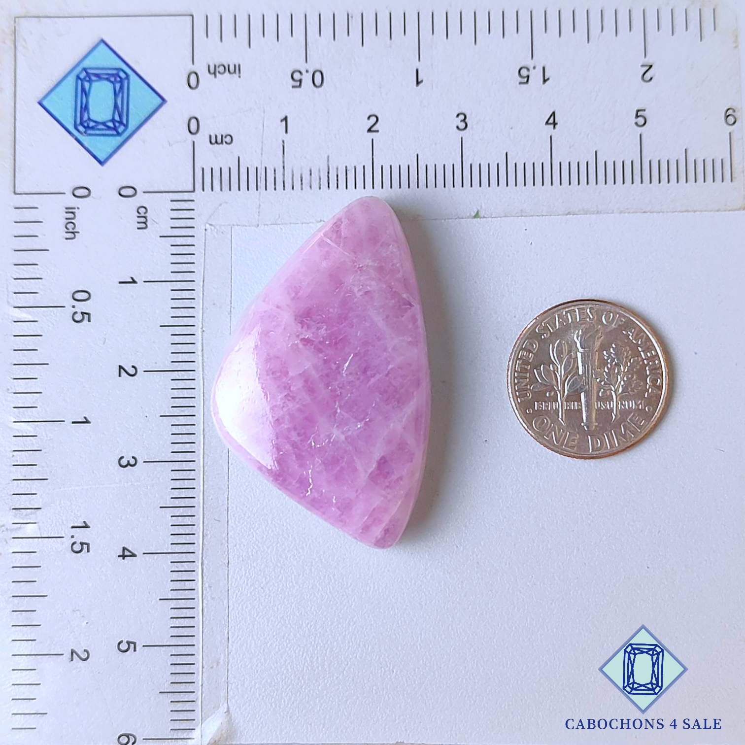Deslice las imágenes para ver la piedra con la tabla de dimensiones. Esta es una gema de kunzita. El producto es natural, de fantasía y opaco. La gema de kunzita es de color púrpura y mide 38 x 24 x 8 mm. La claridad de esta pieza de kunzita es opaca. El producto está disponible exactamente como se muestra en la imagen: 1 pieza de cabujones de fantasía de kunzita certificados por el precio indicado anteriormente.