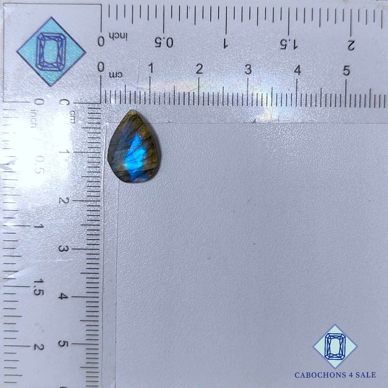 Deslice las imágenes para ver la piedra con la tabla de dimensiones. Esta es una labradorita natural, translúcida, de corte pera. Es de color azul y mide 15 x 10 x 4 mm. Su claridad es translúcida. El producto está disponible exactamente como se muestra en la imagen: 1 labradorita con corte rosa pera certificada por el precio indicado anteriormente.