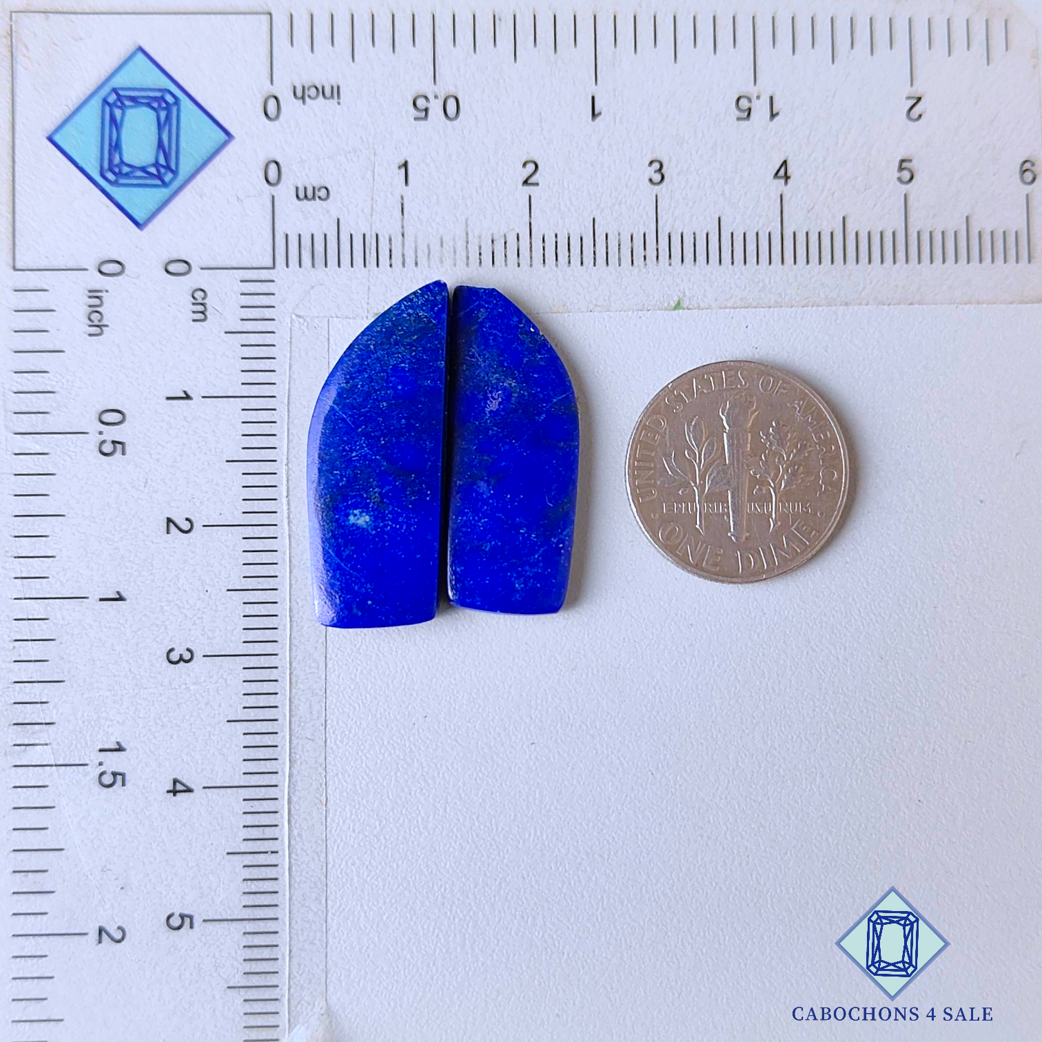 Deslice las imágenes para ver la piedra con la tabla de dimensiones. Esta es una gema de lapislázuli. El producto es natural, de fantasía y opaco. La gema de lapislázuli es de color azul y mide 26 x 10 x 3 mm. La claridad de esta pieza de lapislázuli es opaca. El producto está disponible exactamente como se muestra en la imagen: 1 par de lapislázuli de fantasía certificado por el precio indicado anteriormente.
