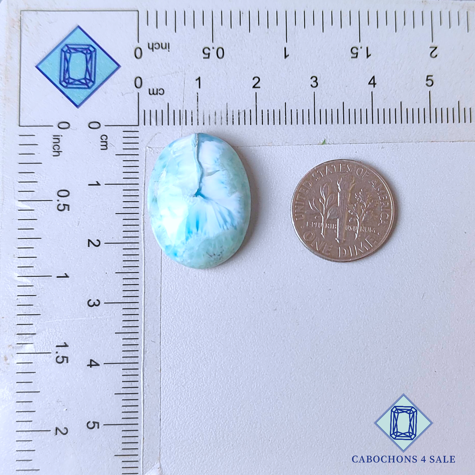 Deslice las imágenes para ver la piedra con la tabla de dimensiones. Esta es una gema de larimar. El producto es natural, ovalado y opaco. La gema de larimar es azul y mide 23 x 17 x 6 mm. La claridad de esta pieza de larimar es opaca. El producto está disponible exactamente como se muestra en la imagen: 1 pieza de cabujones ovalados con certificación de larimar por el precio indicado anteriormente.