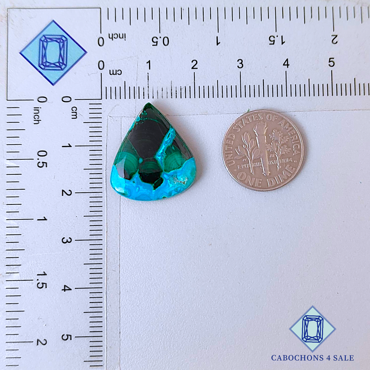 Deslice las imágenes para ver la piedra con la tabla de dimensiones. Esta es una gema de malaquita crisocola. El producto es natural, de forma pera y opaco. La malaquita crisocola es de color verde y mide 21 x 18 x 4 mm. La claridad de esta pieza es opaca. El producto está disponible exactamente como se muestra en la imagen: 1 pieza de cabujones de malaquita crisocola en forma de pera certificados por el precio indicado anteriormente.