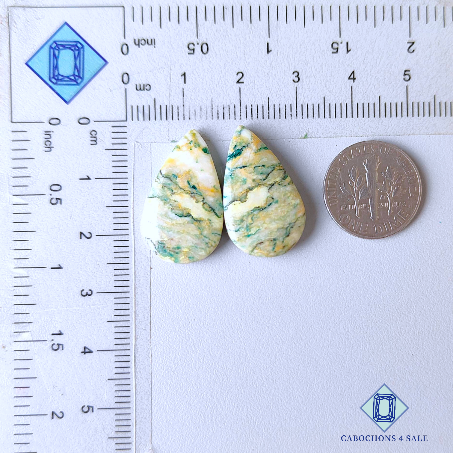 Deslice las imágenes para ver la piedra con la tabla de dimensiones. Esta es una gema de mariposita. El producto es natural, de forma pera y opaco. La gema de mariposita es verde y mide 24 x 14 x 3 mm. La claridad de esta pieza es opaca. El producto está disponible exactamente como se muestra en la imagen: 1 par de mariposita de forma pera certificada por el precio indicado anteriormente.