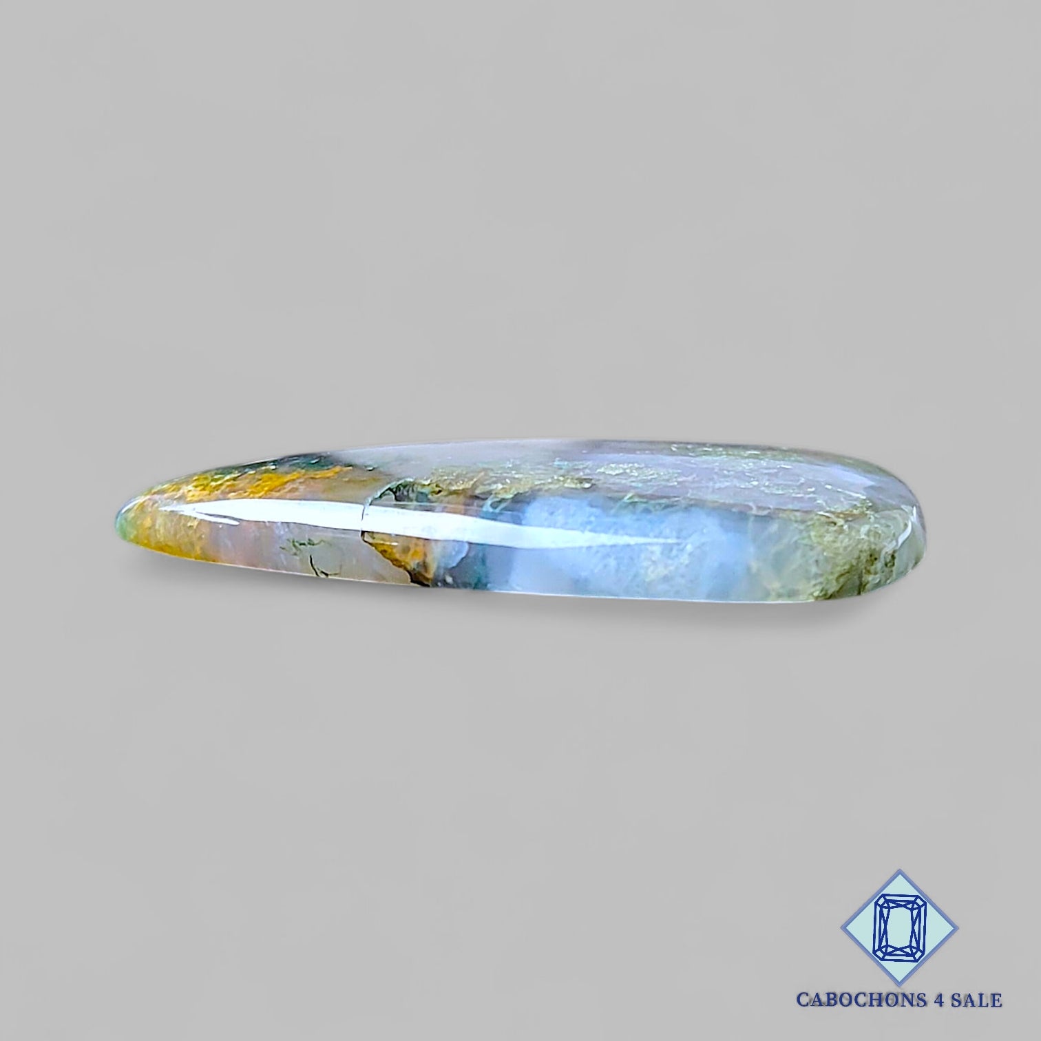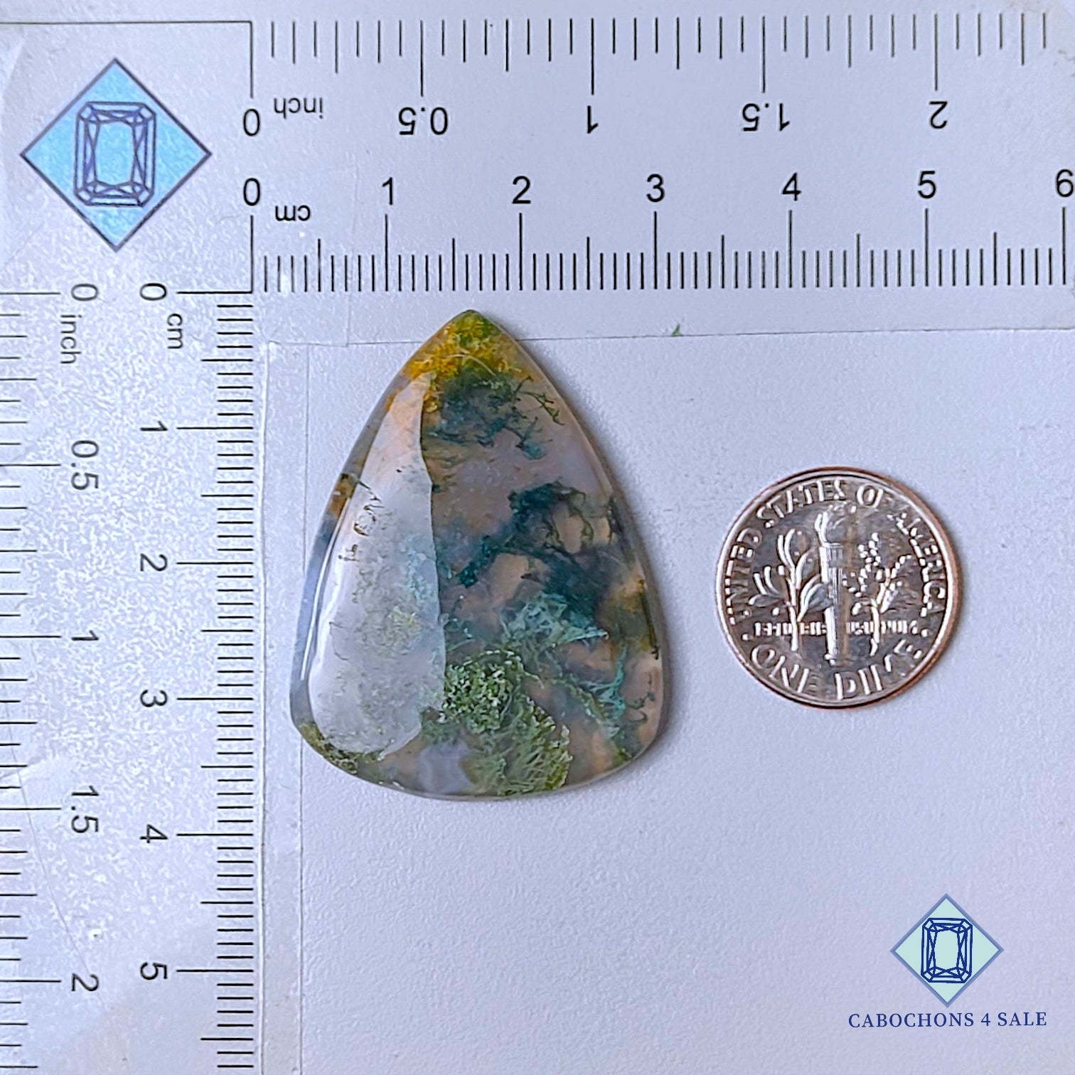 Deslice las imágenes para ver la piedra con la tabla de dimensiones. Esta es una gema de ágata musgosa. El producto es una gema natural de ágata musgosa translúcida de color verde con un tamaño de 36 x 27 x 5 mm. La claridad de esta pieza es translúcida. El producto está disponible exactamente como se muestra en la imagen: 1 pieza de cabujones de ágata musgosa con certificación de pera por el precio indicado anteriormente.
