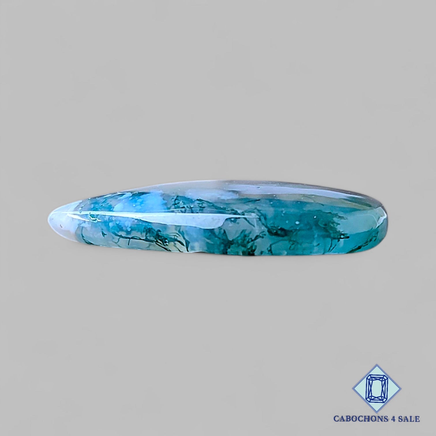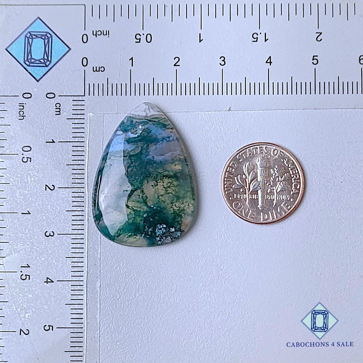Deslice las imágenes para ver la piedra con la tabla de dimensiones. Esta es una gema de ágata musgosa. El producto es una gema natural de ágata musgosa translúcida de color verde con un tamaño de 31 x 22 x 5 mm. La claridad de esta pieza es translúcida. El producto está disponible exactamente como se muestra en la imagen: 1 pieza de cabujones de ágata musgosa con certificación de pera por el precio indicado anteriormente.