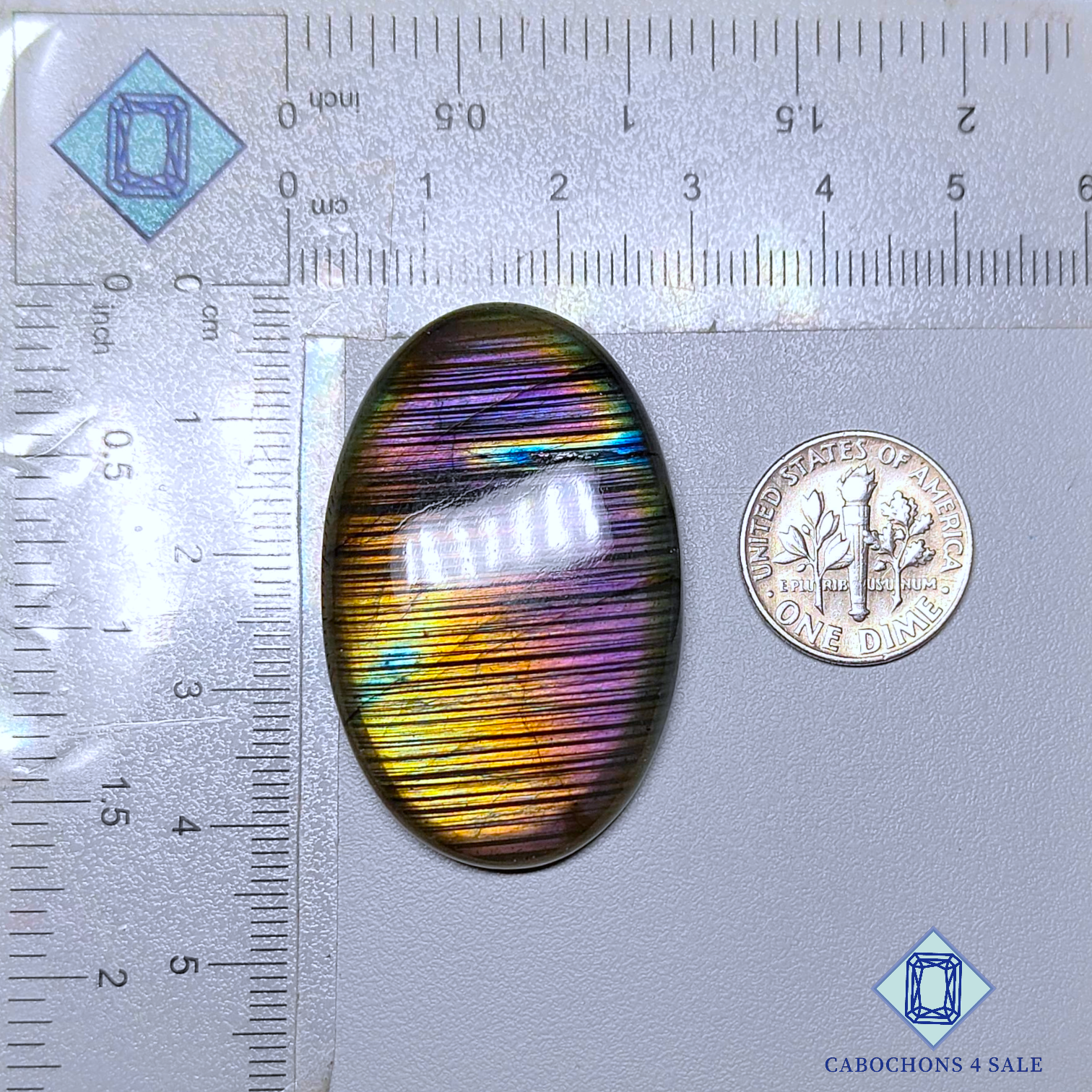 Deslice las imágenes para ver la piedra con la tabla de dimensiones. Esta es una labradorita púrpura multicapa. El producto es natural, ovalado y translúcido. La labradorita púrpura multicapa es de color púrpura y mide 41 x 26 x 7 mm. La claridad de esta labradorita púrpura multicapa es translúcida. El producto está disponible exactamente como se muestra en la imagen: 1 cabujón ovalado de labradorita púrpura multicapa certificado por el precio indicado anteriormente.