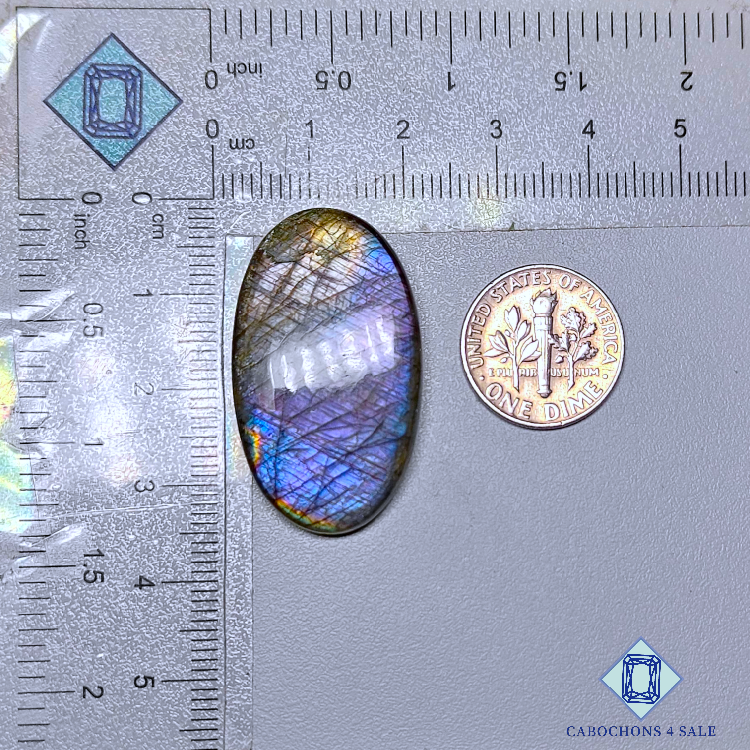 Deslice las imágenes para ver la piedra con la tabla de dimensiones. Esta es una labradorita morada. El producto es natural, ovalado y translúcido. La labradorita morada es de color morado y mide 34 x 19 x 5 mm. La claridad de esta labradorita morada es translúcida. El producto está disponible exactamente como se muestra en la imagen: 1 cabujón ovalado de labradorita morada certificado por el precio indicado anteriormente.