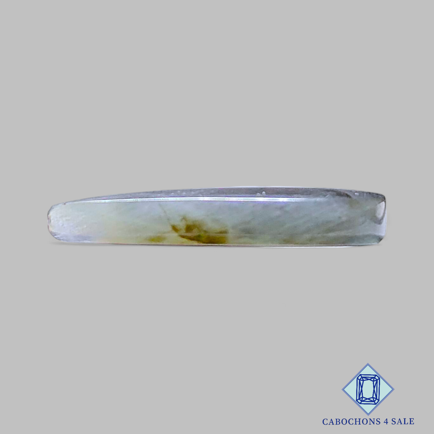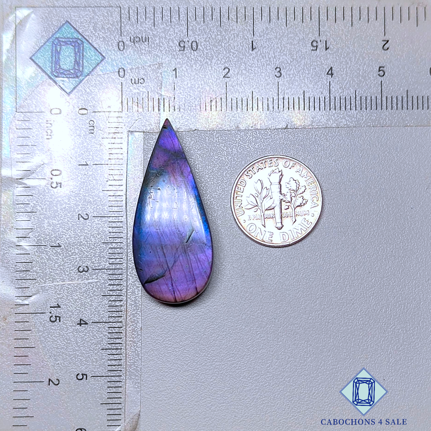 Deslice las imágenes para ver la piedra con la tabla de dimensiones. Esta es una labradorita morada. El producto es natural, de forma pera y translúcida. La labradorita morada es de color morado y mide 35 x 15 x 5 mm. La claridad de esta labradorita morada es translúcida. El producto está disponible exactamente como se muestra en la imagen: 1 cabujón de labradorita morada con certificación pera, por el precio indicado anteriormente.