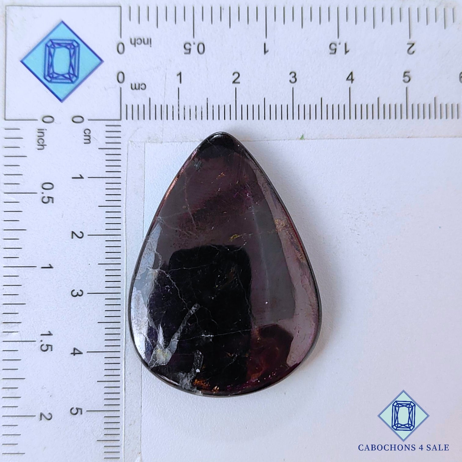 Deslice las imágenes para ver la piedra con la tabla de dimensiones. Esta es una gema purpurita. El producto es natural, de forma pera y opaco. La purpurita es de color púrpura y mide 45 x 32 x 6 mm. La claridad de esta pieza es opaca. El producto está disponible exactamente como se muestra en la imagen: 1 pieza de cabujones pera de purpurita certificados por el precio indicado anteriormente.