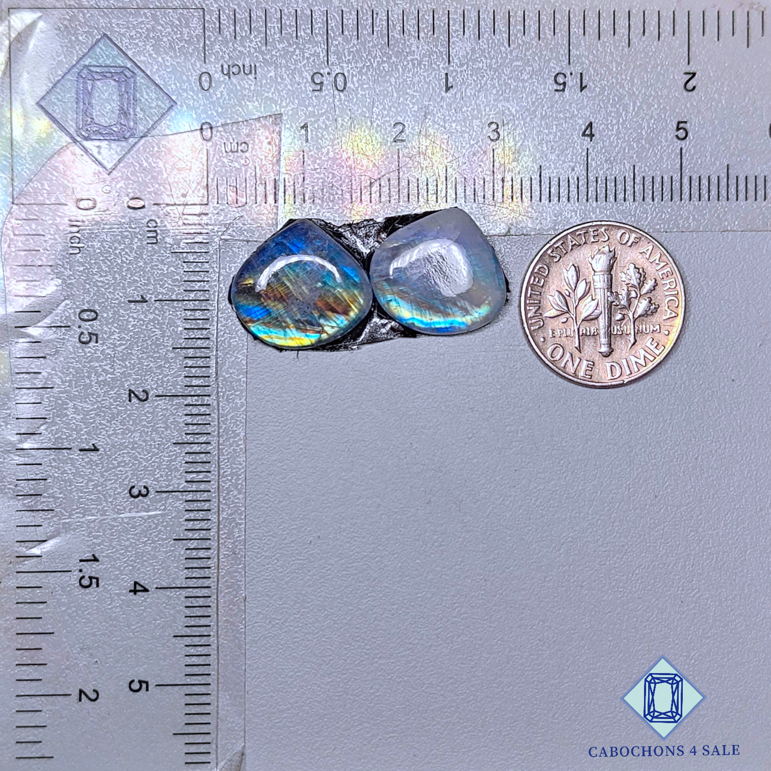 Deslice las imágenes para ver la piedra con la tabla de dimensiones. Esta es una gema de piedra lunar arcoíris. El producto es natural, de forma pera y translúcida. La piedra lunar arcoíris es de color azul y mide 13 x 14 x 3 mm. La claridad de esta piedra lunar arcoíris es translúcida. El producto está disponible exactamente como se muestra en la imagen: 1 par de piedras lunares arcoíris de forma pera certificadas por el precio indicado anteriormente.